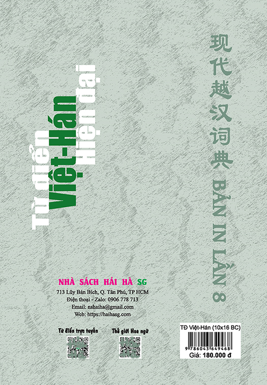 Khổ 10x16, bìa cứng, 1424 trang, in giấy trắng đẹp Nhằm đáp ứng nhu cầu tra cứu từ Việt sang Hán của người học tiếng Hán, nhất là để phục vụ cho đối tượng học