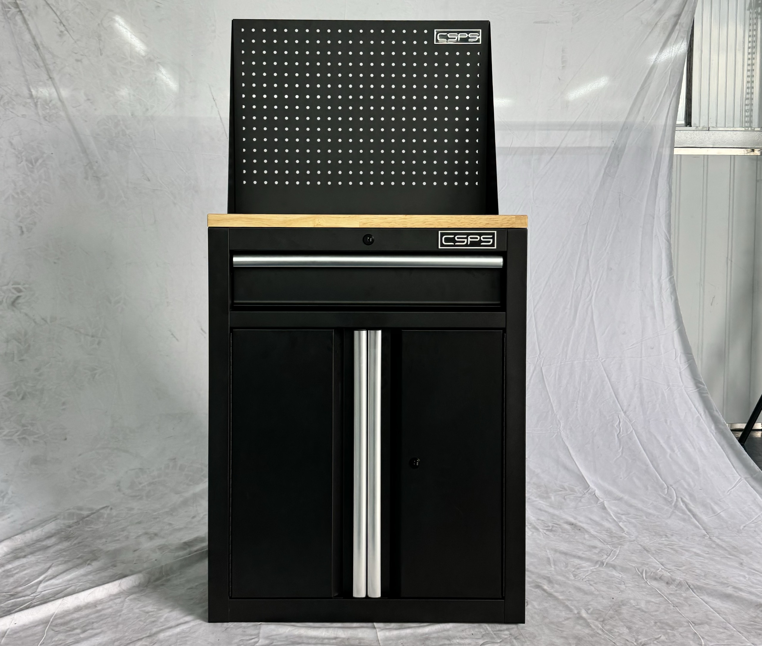 Tủ dụng cụ 61cm - 01 hộc kéo màu đen chân tăng chỉnh ván gỗ vách lưới (tay cầm trắng)