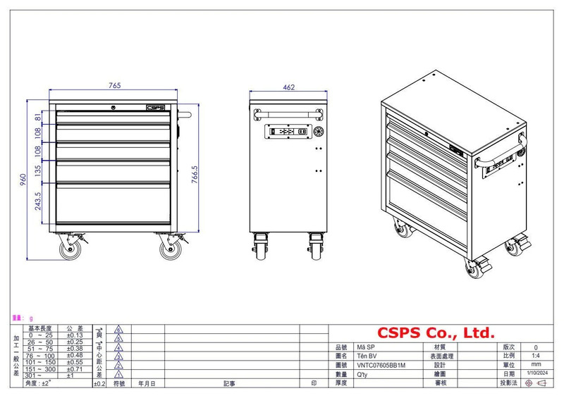Tủ dụng cụ CSPS 61cm - 04 hộc kéo màu đen bánh xe (tay cầm trắng) THÔNG SỐ KỸ THUẬT: 1.THÔNG SỐ CHUNG Kích thước đóng gói/ Package dimension: 62cm W x 43cm D x