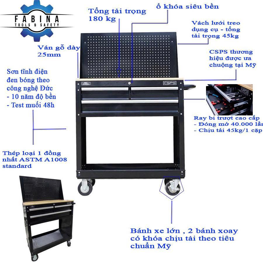 Tủ dụng cụ CSPS 7 ngăn kéo, mặt ván gỗ và vách lưới chất lượng cao. THÔNG SỐ KỸ THUẬT 1 THÔNG SỐ CHUNG Kích thước sản phẩm: 76.4 cm Ngang x 46.2cm Sâu x 96