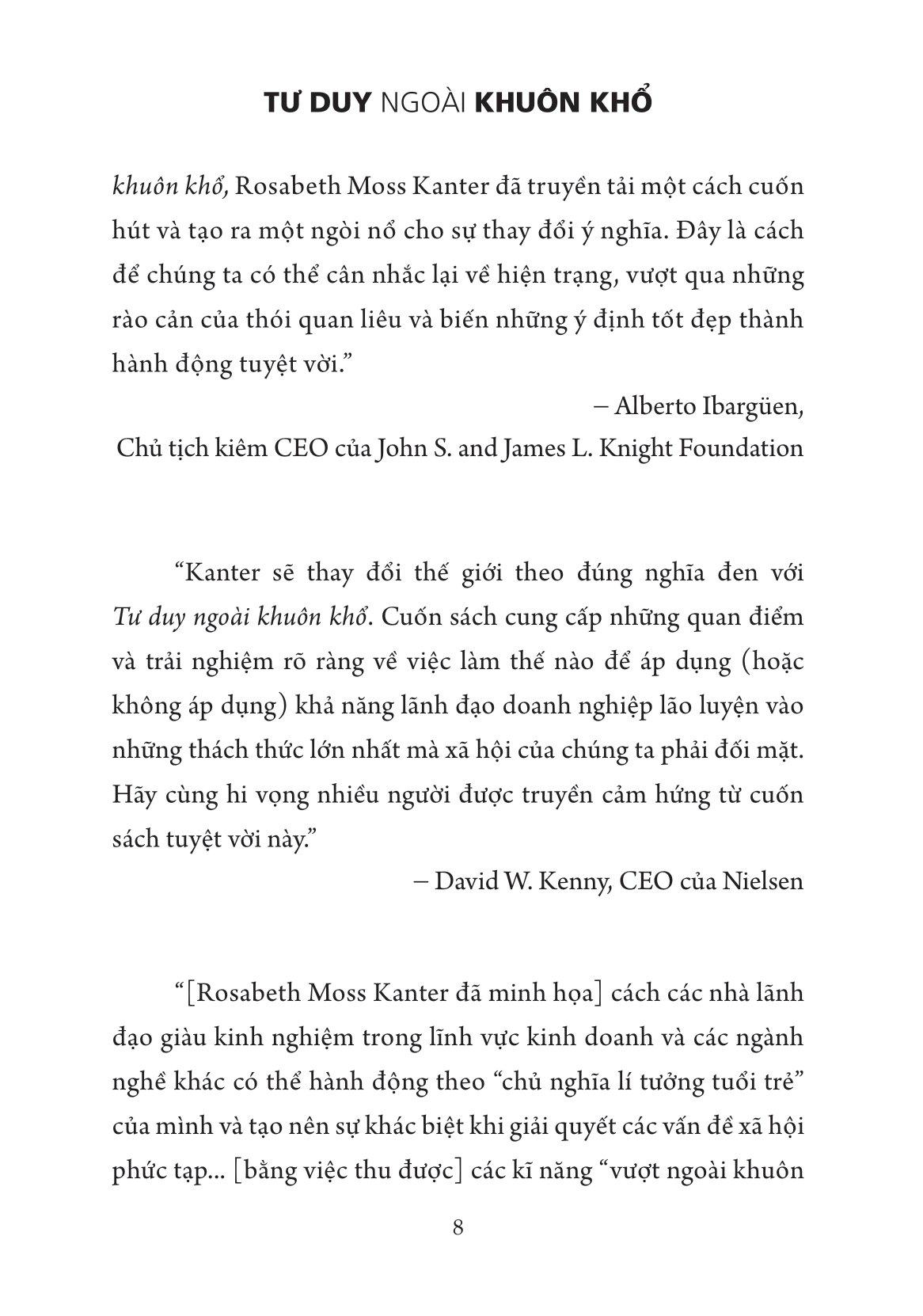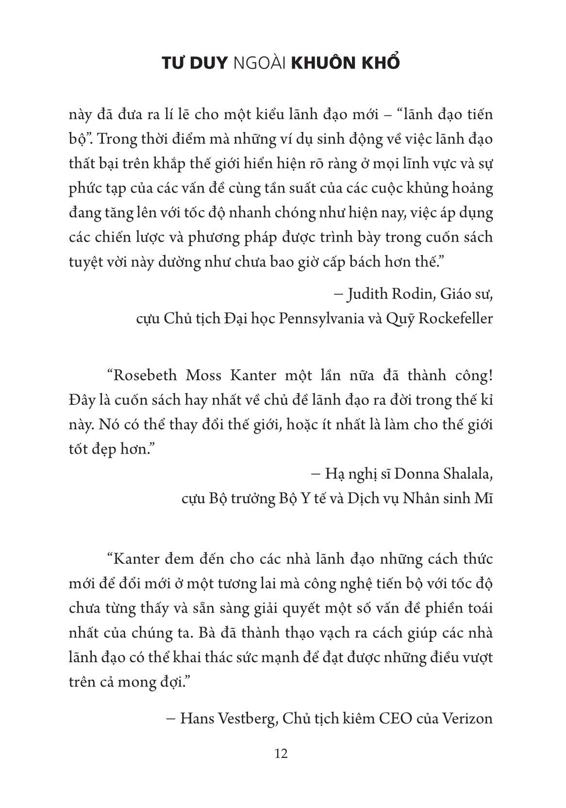 “Kanter sẽ thay đổi thế giới theo đúng nghĩa đen với Tư duy ngoài khuôn khổ. Cuốn sách cung cấp những quan điểm và trải nghiệm rõ ràng về việc làm thế nào để áp dụng (hoặc không áp dụng) khả năng lãnh đạo doanh nghiệp lão luyện vào những thách thức lớn nhất mà xã hội của chúng ta phải đối mặt. Hãy cùng hi vọng nhiều người được truyền cảm hứng từ cuốn sách tuyệt vời này.” - David W. Kenny, CEO của Nielsen “[Rosabeth Moss Kanter đã minh họa] cách các nhà lãnh đạo giàu kinh nghiệm trong lĩnh vực kinh doanh và các ngành nghề khác có thể hành động theo “chủ nghĩa lí tưởng tuổi trẻ” của m.ình và tạo nên sự khác biệt khi giải quyết các vấn đề xã hội phức tạ [bằng việc thu được] các kĩ năng “vượt ngoài khuôn khổ, phá vỡ xi-lô1” cần thiết để giải quyết “các vấn đề hệ thống phức tạp, lộn xộn” từ bất bình đẳng thu nhập đến buôn người. Trong cuốn sách ấn tượng này, Kanter đã kể những câu chuyện cuốn hút về việc lãnh đạo táo bạo, giàu sức tưởng tượng. Trong mỗi trường hợp, vấn đề xã hội đầy rẫy sự mơ hồ và xung đột mà không có một tổ chức nào chịu trách nhiệm, và thách thức là phải tìm ra những cách tiếp cận mới, bất quy tắc, thu hút nhiều bên liên quan.” − Tạp chí Kirkus Reviews (đánh giá được gắn sao) Như mọi nhà lãnh đạo và doanh nhân tìm kiếm sự thay đổi đều biết, sự đổi mới hiếm khi xuất phát từ sâu bên trong tổ chức. Những người đương nhiệm có xu hướng bảo vệ các quyết định trong quá khứ và sẽ không dễ dàng từ bỏ quyền lực. Hoặc đôi khi chỉ đơn giản là họ cảm thấy hoang mang trước những gì đang xảy ra, lo sợ về sự bất định của các thay đổi. Hoặc họ không biết gì về những khả năng tích cực mà sự thay đổi có thể mang lại. Vì vậy, họ quyết định ở bên trong thành trì và gia cố các bức tường của nhiều căn phòng đang giam giữ những người cư ngụ trong thành trì. Với sự phòng thủ mạnh mẽ như vậy trước sự thay đổi, các ý tưởng mới đến từ những người làm được nhiều hơn việc tư duy ngoài khuôn khổ căn phòng của m.ình. Họ tư duy ngoài khuôn khổ tòa nhà. Cuốn sách này phản ánh việc tìm kiếm những khả năng mới cho sự thay đổi tích cực. Tác giả sẽ thông qua cuốn sách để cho thấy được cách để đổi mới và thúc đẩy sự thay đổi có thể tái định hình các tổ chức hiện tại cũng như kích thích việc tạo ra các tổ chức mới. Đây là cuốn cẩm nang để đưa việc lãnh đạo nên một cấp độ hoàn toàn mới! LÃNH ĐẠO TIẾN BỘ LÀ GÌ? Cái tên lãnh đạo tiến bộ bắt đầu như là một cách chơi chữ để lôi kéo những người xuất sắc, có kinh nghiệm tham gia vào một phong trào vẫn còn sơ khai. Lãnh đạo tiến bộ ngụ ý đến một phương thức hành động hơn là một giai đoạn cuộc đời. Nó là một bước đi vượt khỏi kiểu lãnh đạo, có thể tuyệt vời hoặc không, nhưng đều chỉ được thực hiện chủ yếu trong một tổ chức hoặc lĩnh vực chuyên tâm tập trung vào việc thúc đẩy các mục tiêu của chính nó. Lãnh đạo tiến bộ mở rộng phạm vi lãnh đạo. Nó bao hàm việc vượt khỏi các ranh giới, xuyên qua các xi-lô và ở ngoài các cấu trúc đã được thiết lập. Nó bắt nguồn từ ý thức về mục đích hướng tới việc thay đổi hệ thống, cho dù là một hệ sinh thái cụ thể hay một tập hợp rộng hơn các thể chế và kì vọng. Nó đề cập đến các kĩ năng và hiểu biết hữu ích cho bất cứ doanh nhân và nhà đổi mới nào đang cố gắng giải quyết các vấn đề quan trọng ảnh hưởng tổng thể đến các lĩnh vực. Đó chính là các loại vấn đề đang gây nhức nhối cho thế giới, căn nguyên của hàng ngàn lời than vãn. Cuốn sách này kể câu chuyện của nhiều người đàn ông và phụ nữ giàu trí tưởng tượng và tràn đầy năng lượng đã tạo ra những đổi mới thông minh bằng cách sử dụng các kĩ năng lãnh đạo tiến bộ. Họ gồm những người mà tôi đã hiểu biết sâu sắc; một số câu chuyện thu được từ gần 50 nghiên cứu tình huống (case study) chi tiết và hàng trăm cuộc phỏng vấn. Quan sát của tác giả Rosabeth Moss Kanter bao gồm các nhà lãnh đạo dân sự và doanh nhân xã hội đang làm việc không mệt mỏi để xây dựng các liên minh nhằm giải quyết những vấn đề xã hội và cộng đồng mà những người khác đã phớt lờ hoặc từ bỏ, chẳng hạn như xóa đi dấu tích của những bức tượng mang tính xúc phạm c.hủng tộc khỏi một thành phố hoặc phát triển một kiểu trường trung học mới. Nữ tác giả đã làm việc với các nhà lãnh đạo trẻ hơn đang nổi, những người mang theo tinh thần kinh doanh để tìm ra giải pháp mới cho các vấn đề cũ, chẳng hạn như thành lập một đội dịch vụ hoặc giúp thanh niên cùng nhau tạo ra các dự án kinh doanh có thể xây dựng cả sự hòa bình lẫn sự thịnh vượng rộng lớn hơn. Điểm chung của tất cả bọn họ là mong muốn vượt ra ngoài các c
