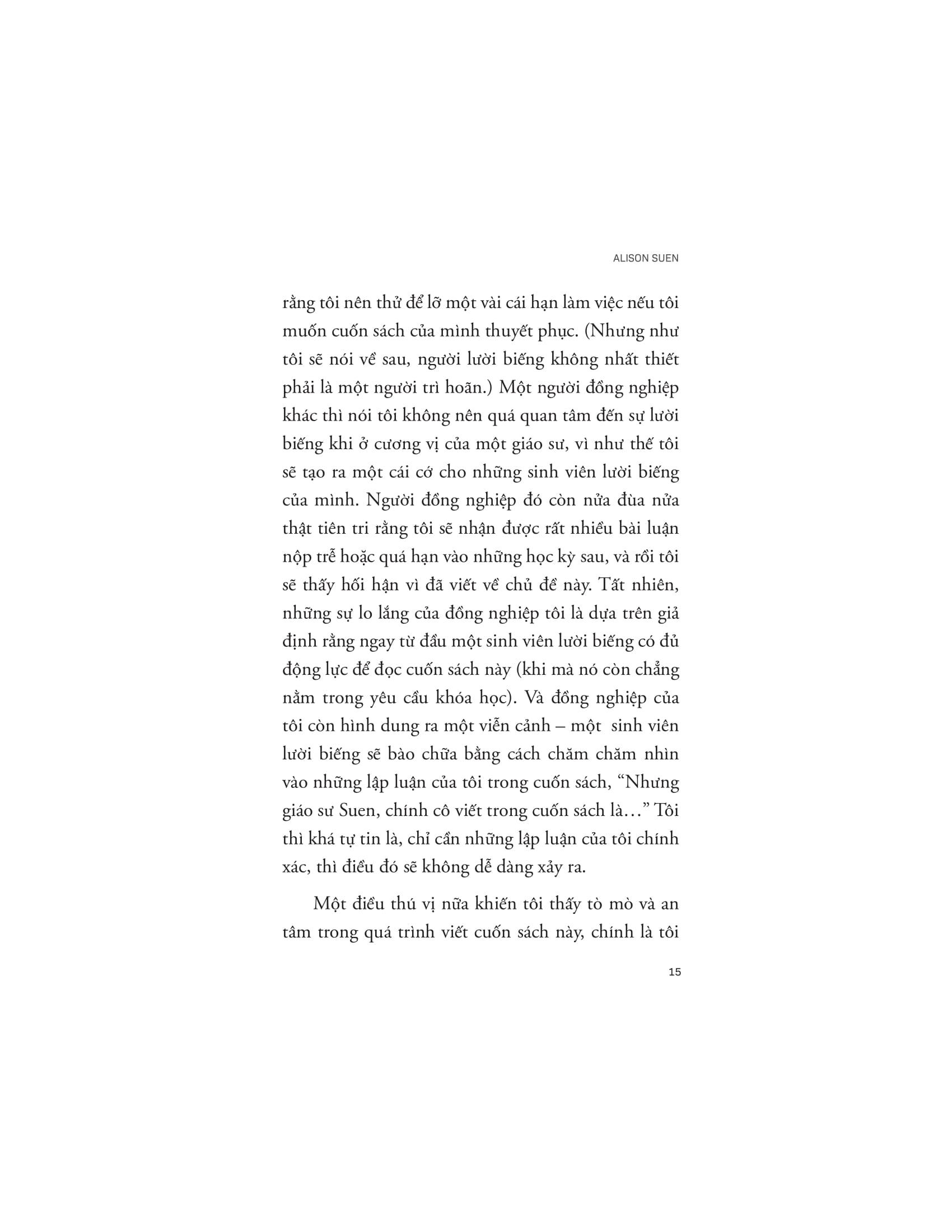 Tư Duy Thành Công Của Người Lười Biếng Chúng ta cho rằng m.ình gặp người lười biếng ở mọi nơi: từ người đồng nghiệp làm cùng, bạn bè xung quanh, cho đến nhân vật trong những bộ phim Hollywood. Nhưng bạn có bao giờ tự hỏi, những người bạn cho là lười biếng ấy có thực sự là kẻ lười biếng không? Hay họ chỉ là những người lầm tưởng rằng bản thân lười biếng? Trong xã hội coi trọng hiệu suất làm việc, chúng ta phải không ngừng nỗ lực chứng tỏ bản thân thông qua những thành tựu của m.ình, liệu những người lười biếng (chỉ làm việc vừa đủ) có đáng bị chỉ trích nặng nề hay không? Cuốn sách “Tư duy thành công của những người lười biếng” sẽ minh oan cho những người lười, buộc chúng ta phải cân nhắc trước khi miêu tả họ bằng những ngôn từ xấu xí. Cuốn sách này không phải biện minh cho thói chây ì của một nhóm người cụ thể, mà là một phân tích triết học dựa trên những bằng chứng khoa học có cơ sở về một chủ đề mà bấy lâu nay người ta vẫn dè bỉu khi nhắc đến – LƯỜI BIẾNG. Tuy cuốn sách này bào chữa cho sự lười biếng, nhưng nó không hề bênh vực lối sống lười biếng. Bằng việc nghiên cứu văn hóa phát huy hiệu suất làm việc, Suen đã nhận định một thực tế rằng đôi khi lười biếng không hề xấu, họ là những người có tư duy khác biệt và thách thức các quan niệm thường thấy về thành công. Về tác giả: Alison Suen là phó Giáo sư chuyên ngành Triết học tại Đại học Iona, New York. Bà cũng là tác giả của cuốn The Speaking Animal: Ethics, Language and the Human-Animal Divide (tạm dịch: Ngôn ngữ loài vật: Văn hóa, ngôn ngữ và sự phân chia Người-Vật) (2015) và cuốn Response Ethics (tạm dịch: Văn hóa phản ứng) (2018).
