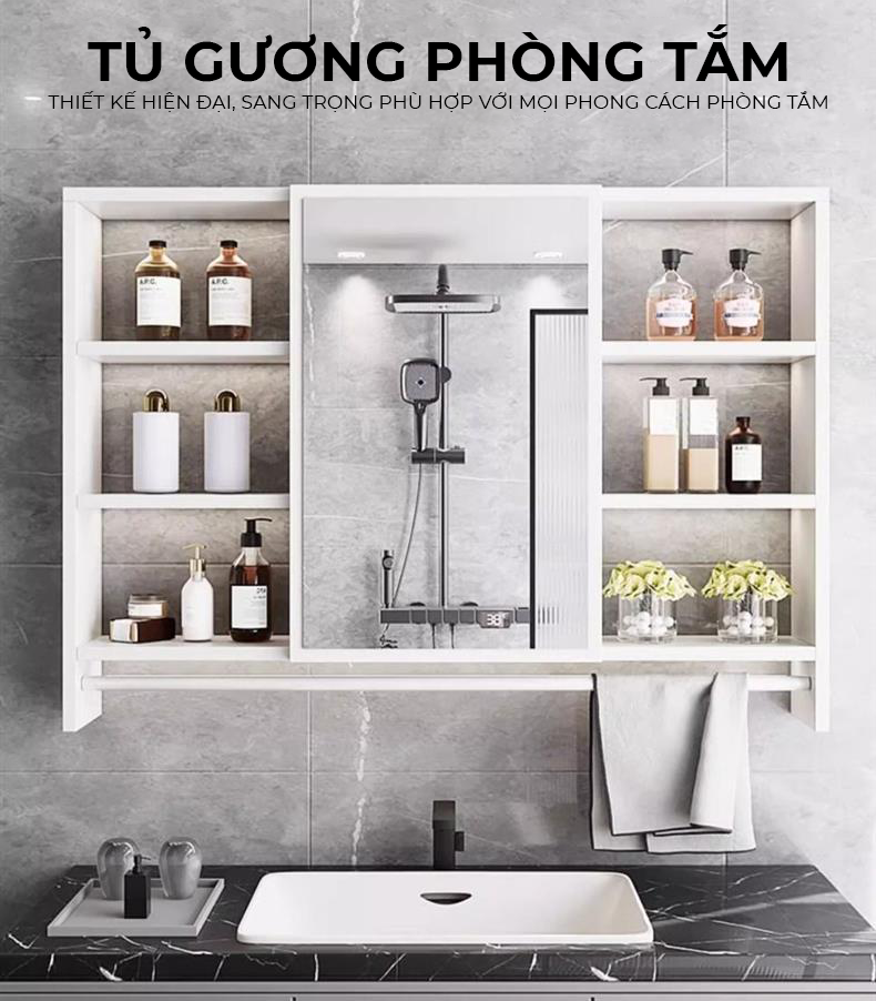 Công năng: tủ đựng đồ dùng, hoá mỹ phẩm,...trong nhà tắm, phòng ngủ....kèm gương soi tiện lợi, tiết kiệm diện tích