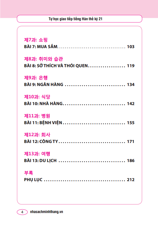 Tự Học Giao Tiếp Tiếng Hàn Thế Kỷ 21 (Kèm CD) Cuốn sách Tự học giao tiếp tiếng Hàn thế kỷ 21 trong mục là cuốn sách giúp các bạn tự học tiếng Hàn một cách dễ dàng.