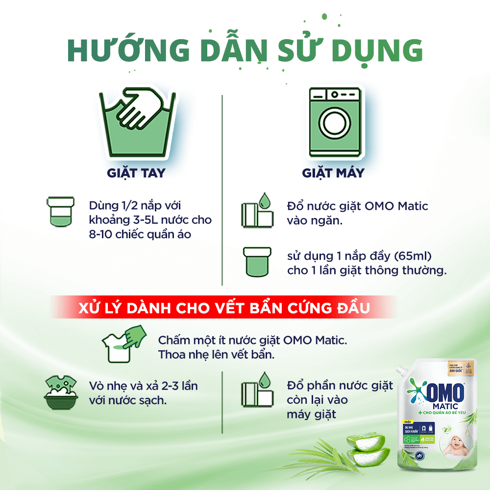 Mua tại TiktokNƯỚC GIẶT OMO MATIC CHO QUẦN ÁO BÉ YÊU - SỰ LỰA CHỌN TUYỆT VỜI DÀNH CHO MẸ Được Viện Da Liễu Trung Ương công nhận, Nước giặt OMO Matic cho Quần áo Bé yêu mang đến cho mẹ sự yên tâm khi sử dụng cho áo quần và đồ dùng của bé. Với công thức chuyên dụng làm sạch dịu nhẹ từ Anh Quốc và thành phần có chứa chiết xuất tràm trà và nha đam, Nước giặt OMO Matic cho Quần áo Bé yêu chăm sóc dịu nhẹ từng sợi vải, giúp loại bỏ vết bẩn cà vi khuẩn, giữ áo quần và đồ dùng của em bé luôn mềm mại. ƯU ĐIỂM NỔI BẬT
