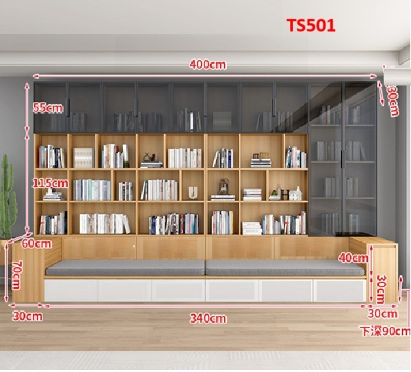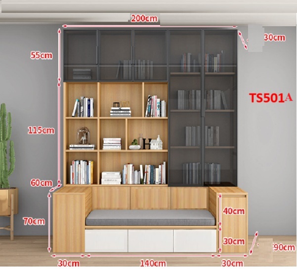Thiết kế thông minh – Tối ưu công năng kết hợp hoàn hảo giữa tủ sách lớn nhiều ngăn, tủ cánh kín phía trên, và ghế ngồi tích hợp đệm êm ái – tạo nên một không gian đọc sách hoàn chỉnh, gọn gàng và tinh tế.