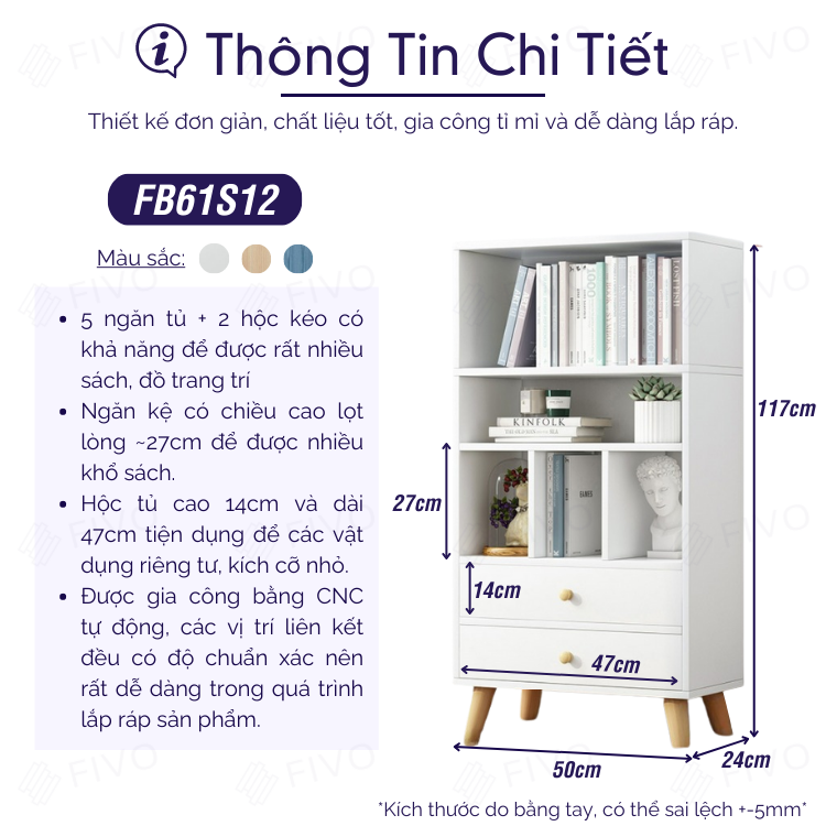 Mô tả sản phẩm kệ gỗ FB73: - Chất liệu: Gỗ MDF dày 17mm lõi xanh chống ẩm, bề mặt phủ Melamine kháng nước, chống thấm và chống trầy xước. - Kiểu dáng: Kệ 5 tầng