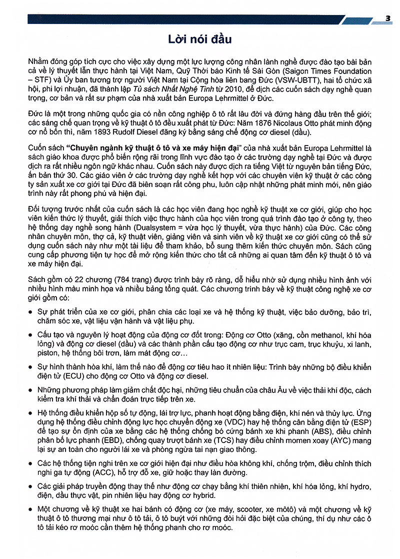 Sách là giáo trình về kỹ thuật ô tô và xe máy hiện đại, từ cơ chế vận hành, cấu tạo máy móc, khả năng ứng dụng đến việc bảo quản, bảo trì, thông tin
