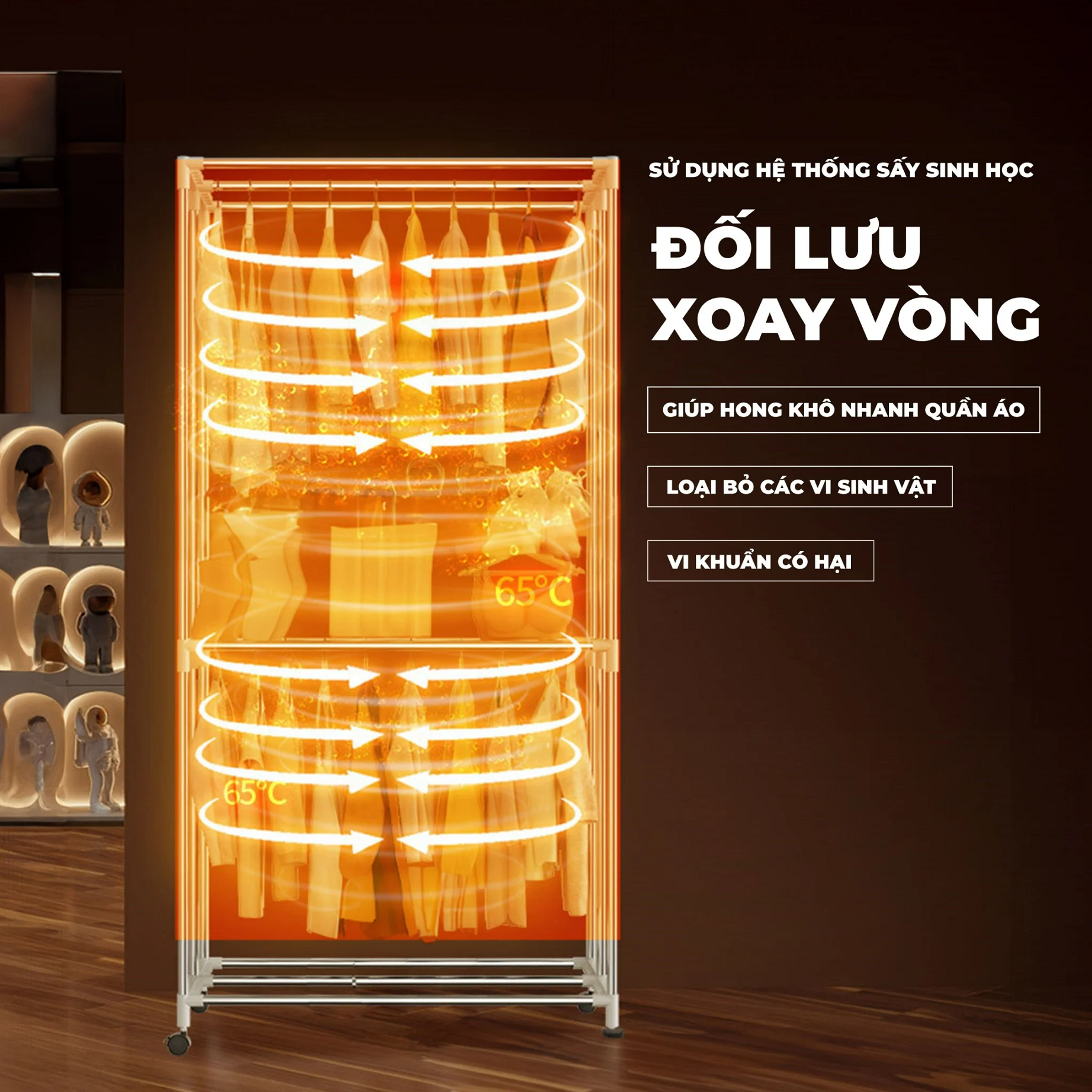 Điểm nổi bật Công suất 1500W, 2 tầng Công nghệ sưởi sấy PTC CERAMIC Đa chức năng sấy khô, sưởi ấm, tủ đựng quần áo Bộ phân tản nhiệt thiết kế 360 độ giúp giúp