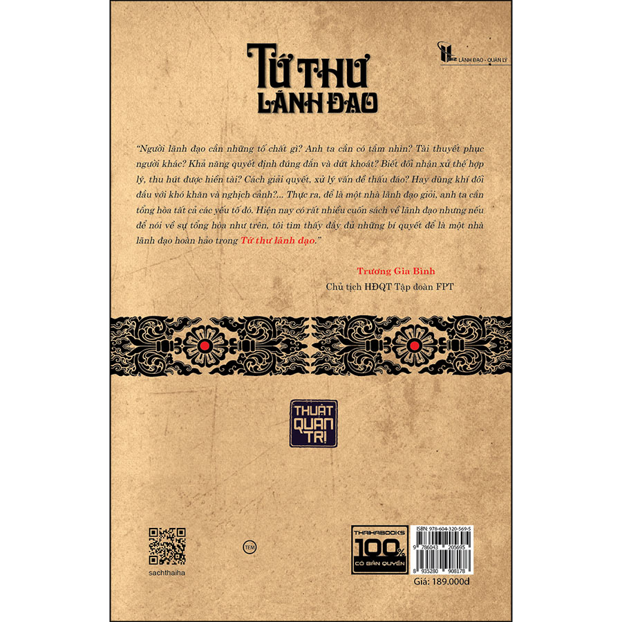 Hộp sách gồm bốn cuốn: – Tứ thư lãnh đạo – Thuật lãnh đạo: Sẽ tiếp thêm cho bạn năng lực để trở thành nhà lãnh đạo mà không nhất thiết phải học rộng. – Tứ
