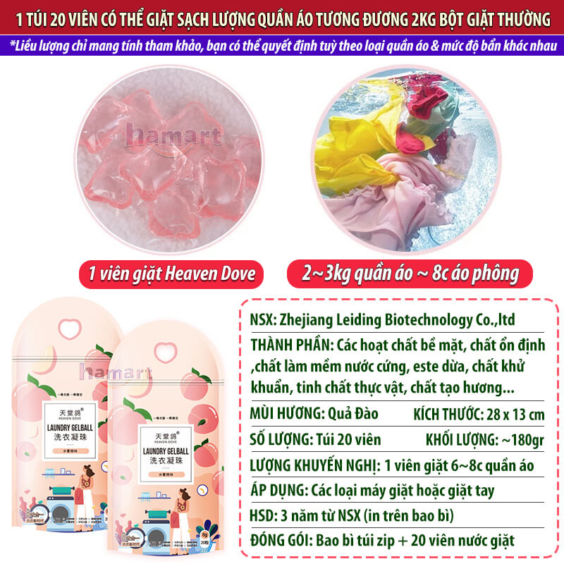 ✨Túi 20 Viên Nước Giặt Quần Áo Hương Đào Heaven Dove 3 Trong 1 Hạt Giặt Xả Đồ Lưu Hương Tiện Lợi