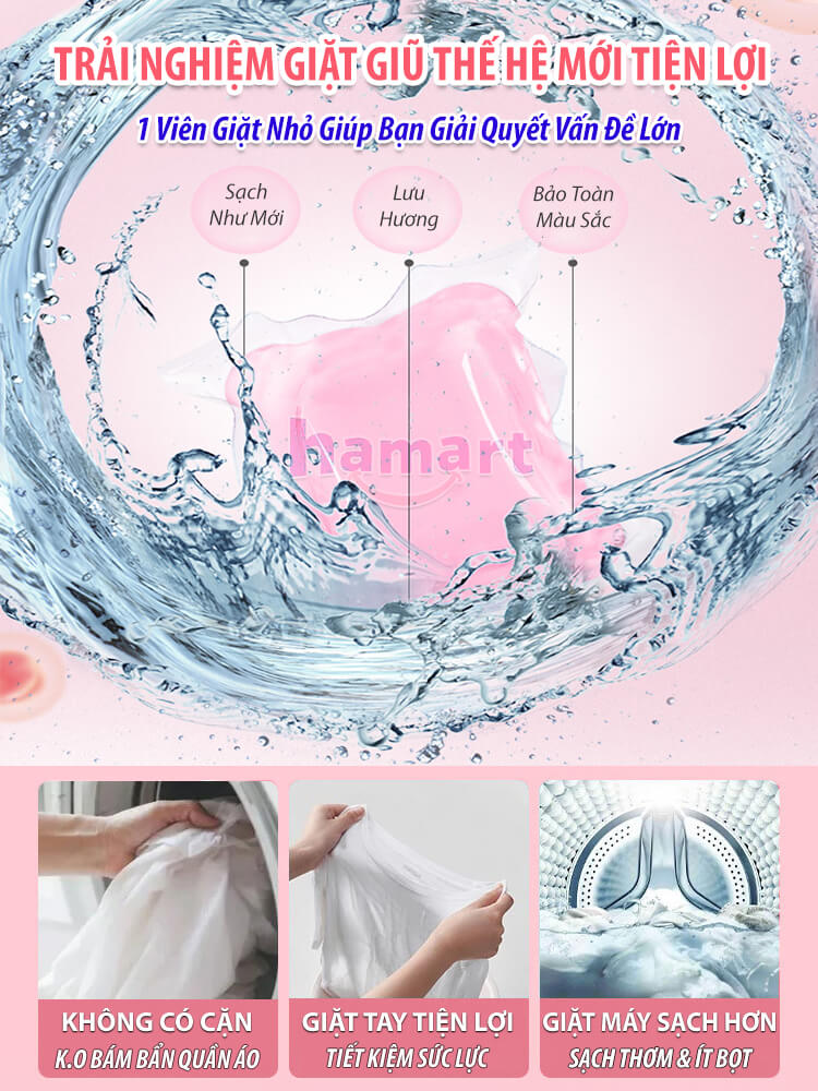 - Viên giặt là sự kết hợp giặt xả, làm mềm vải, lưu hương thơm 3 trong 1, bạn không cần dùng thêm nước xả vải