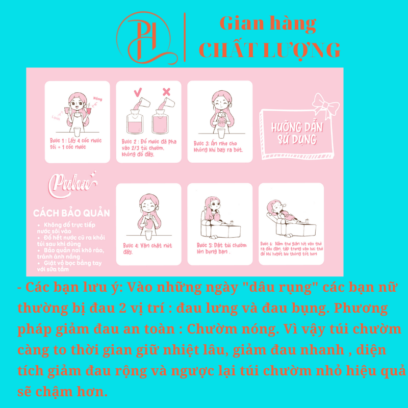 - Giảm đau nhanh và hiệu quả. - Các bạn lưu ý: Vào những ngày "dâu rụng" các bạn nữ thường bị đau 2 vị trí : đau lưng và đau bụng. Phương pháp giảm đau an toàn : Chườm nóng. Vì vậy túi chườm càng to thời gian giữ nhiệt lâu, giảm đau nhanh , diện tích giảm đau rộng và ngược lại túi chườm nhỏ hiệu quả sẽ chậm hơn. *** Chất liệu: