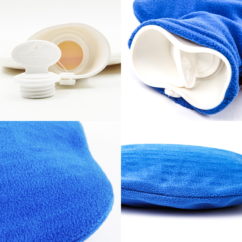 - Bọc: Vải Fleece (vải lông cừu) – Màu sắc: Màu xám, xanh dương, đỏ – Nắp dạng xoắn chống rò rỉ cao – Túi chườm nóng Fashy bọc lông cừu chịu được nhiệt độ từ -20 độ C đến 90 độ CÔNG DỤNG:
