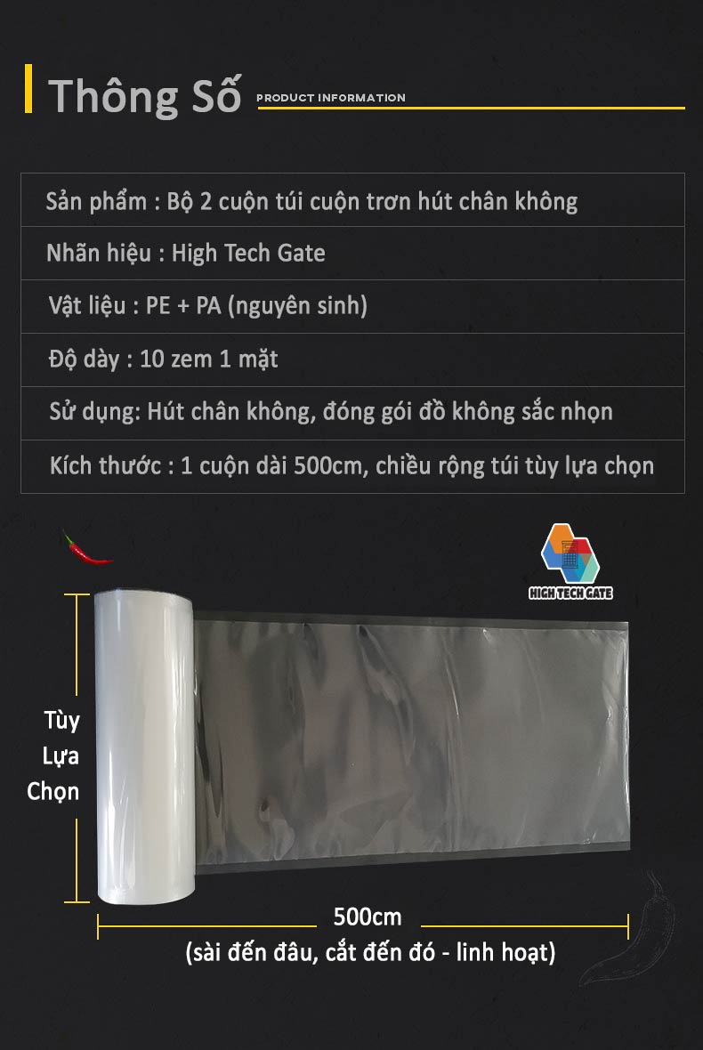 Túi hút chân không thực phẩm HTG trong suốt, dạng cuộn trơn phẳngChiều dài (sâu) mỗi cuộn 500cm - chiều rộng (ngang) túi tùy lựa chọn từ 12cm - 32cm-> Sử dụng đến đâu cắt đến đó theo chiều dài (sâu...