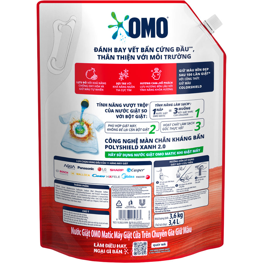 HỒNG PHÁT Nhà Xuất Khẩu: Nước Giặt OMO Matic Cửa Trên Giữ Màu Hương Cam Và Hổ Phách Túi 3.6kg