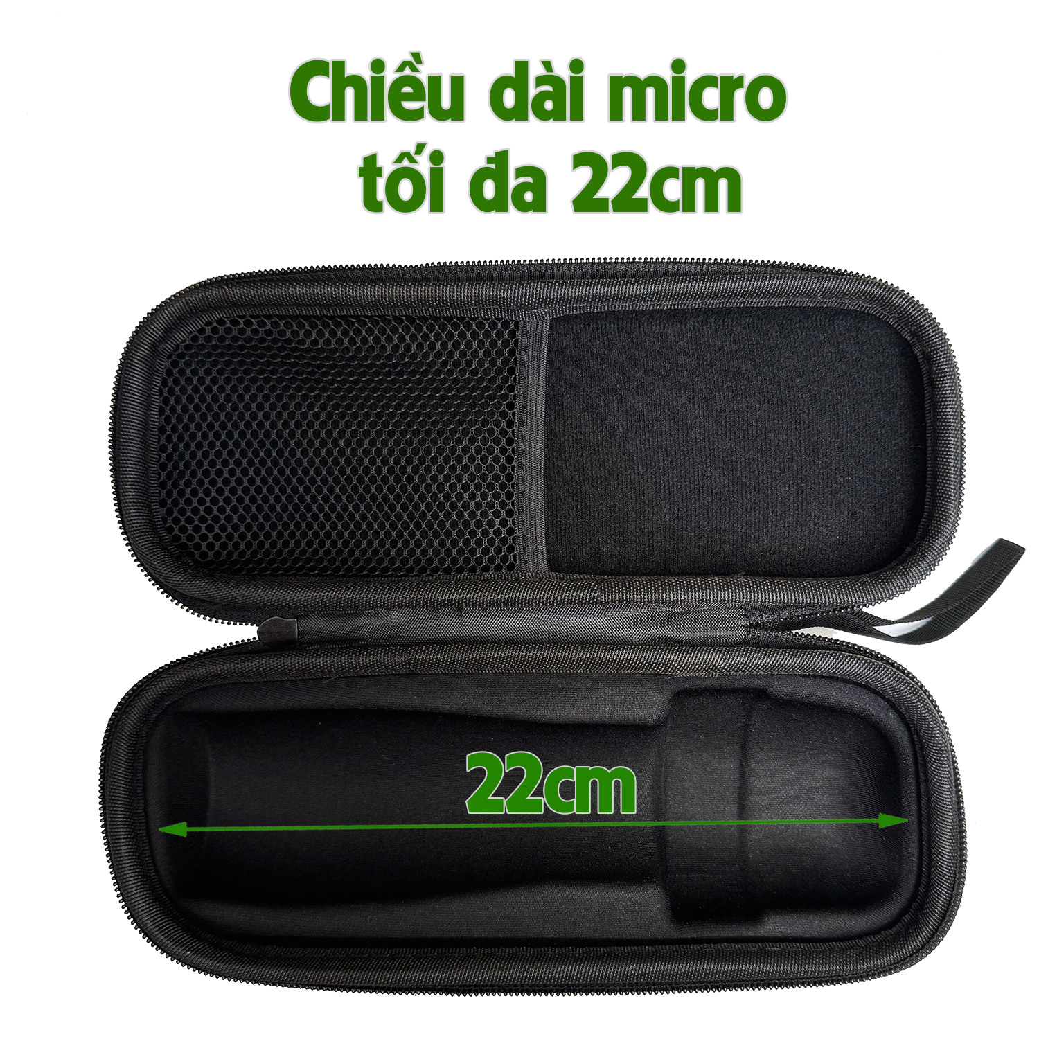 - Kích thước phủ bì: 23.5cm x 9.5cm x 7.5cm; Lọt lòng tối đa 22cm, vui lòng so với chiều dài micro không vượt quá 22cm. Các loại micro dài hơn sẽ không để vừa.