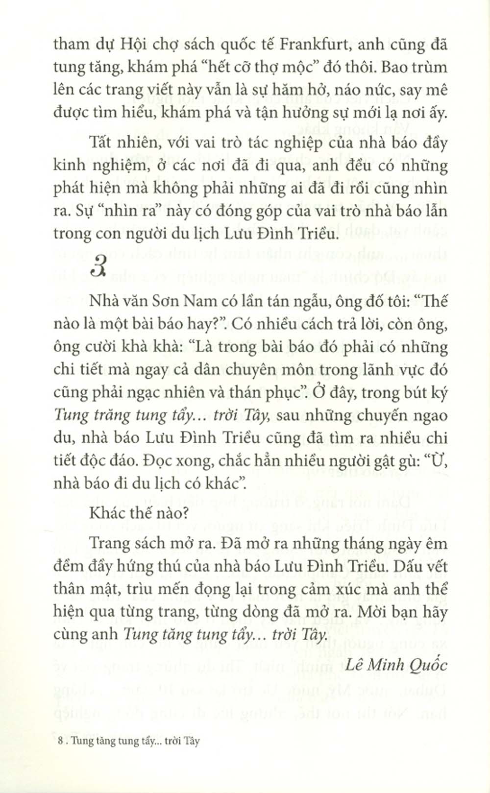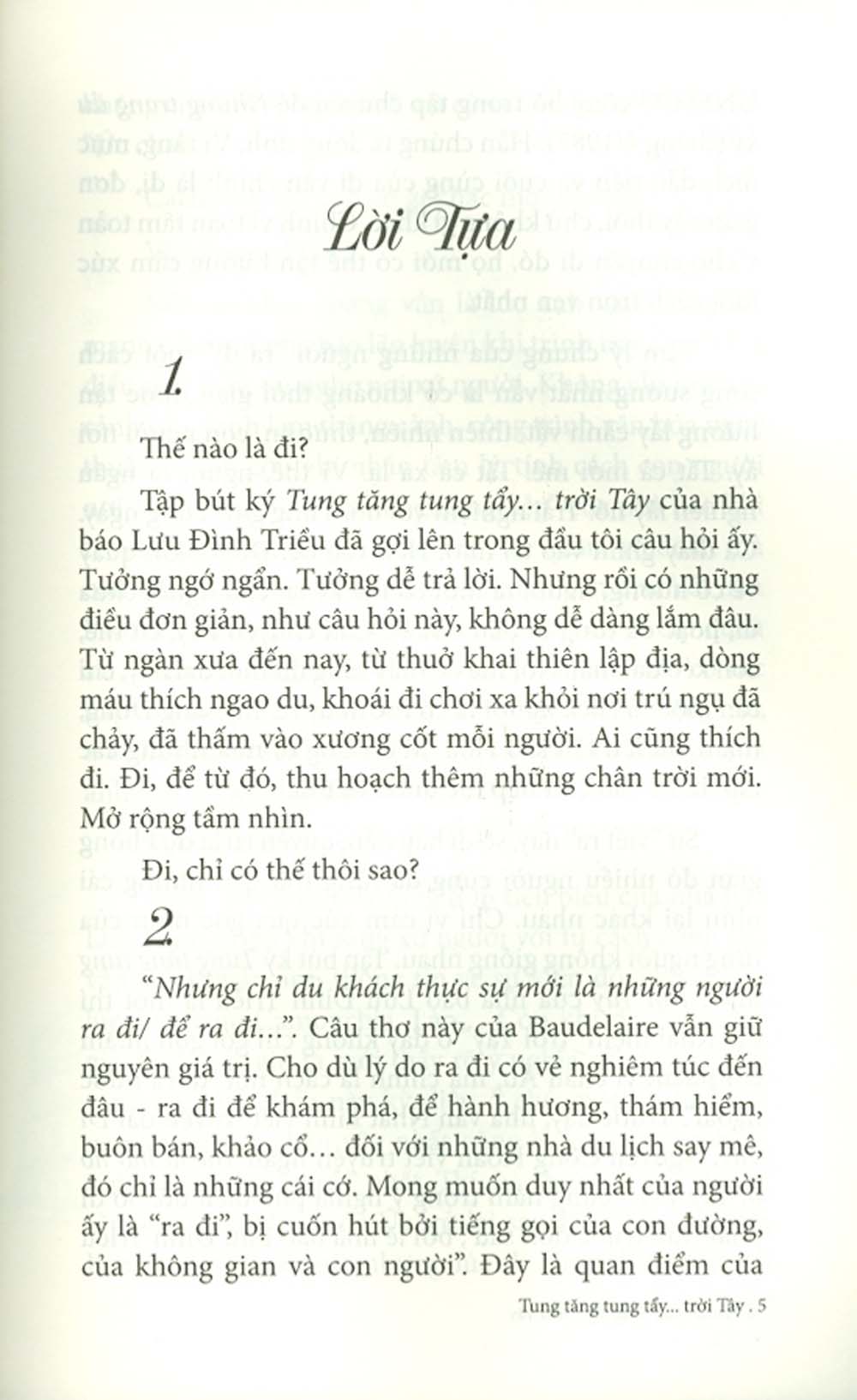 Mua tại TiktokTập bút ký "Tung tăng tung tẩ trời Tây" của nhà báo Lưu Đình Triều không chỉ miêu tả cảnh vật, danh lam thắng cảnh, công trình văn hóa nghệ thuậ anh còn ghi nhận tâm lý, tính cách của con người nơi ấy. Đó chính là "máu nghề nghiệp" của nhà báo khi truyền tải một thông tin, không chủ quan, võ đoán mà còn tiếp cận câu trả lời của người dân bản địa. Với nhà báo, khi du lịch không chỉ đi để đi, mà còn là dịp quan sát, nhận xét và ghi ché