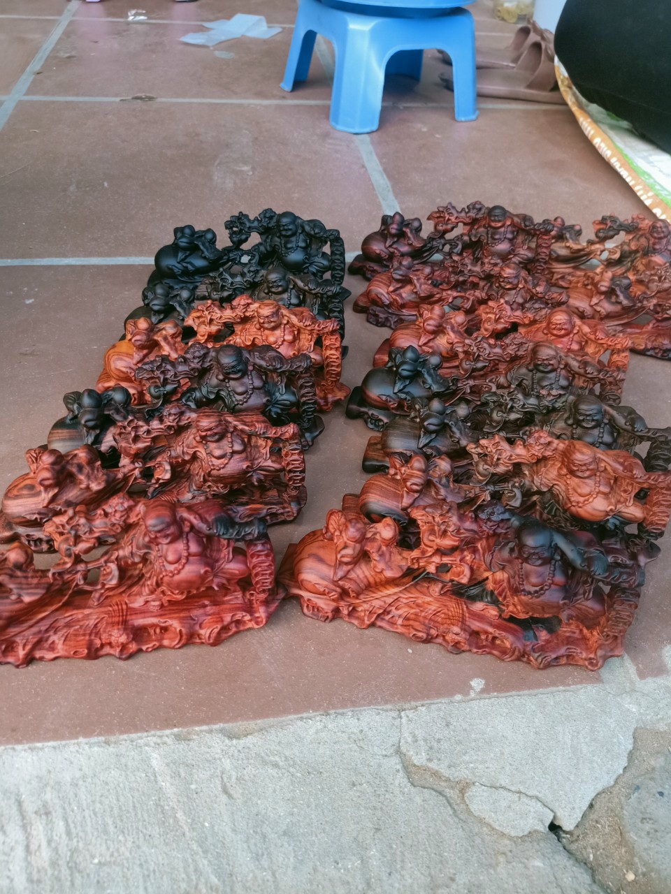 Tượng Di Lặc tam Phúc gỗ Trắc đỏ đen liền khối đục tay, hiếm có khó tìm