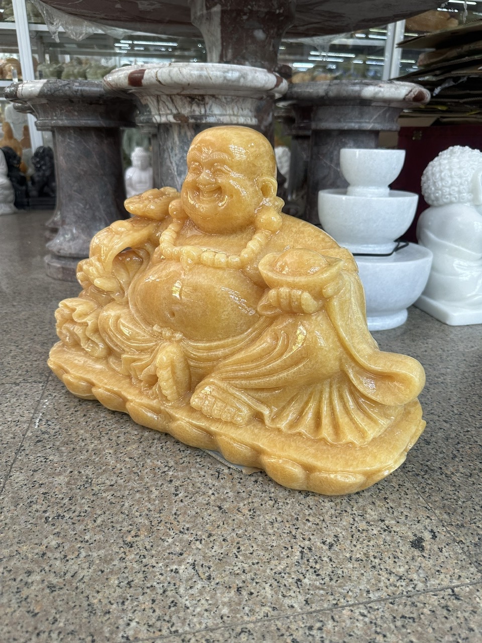 Chất liệu: Đá ngọc Hoàng Long Kích thước: Dài 50 cm x Rộng 20 cm x Cao 34 cm Khối lượng: 40 kg Phật Di Lặc trong Phong thủy Còn gọi là "Phật Cười", Di