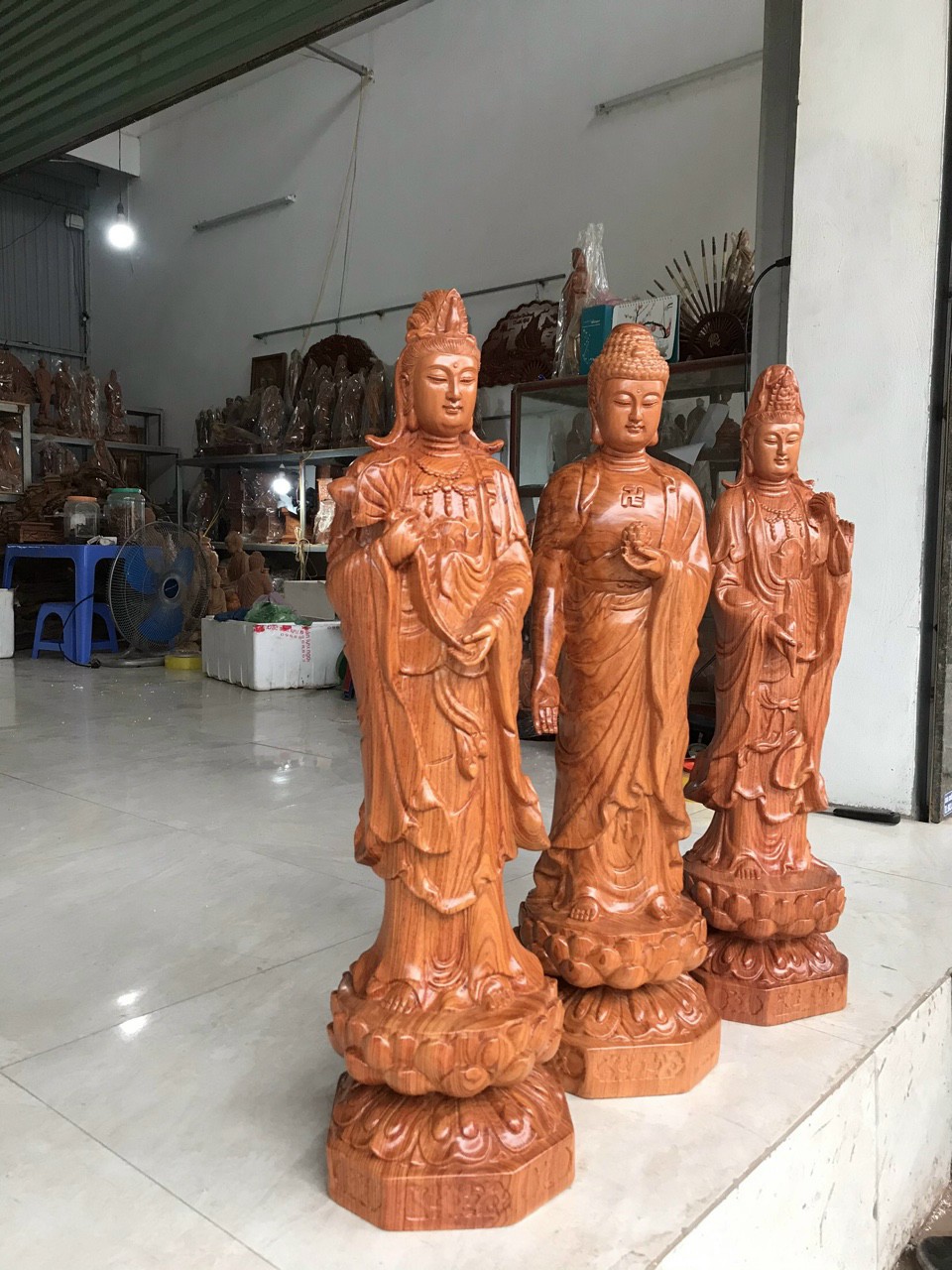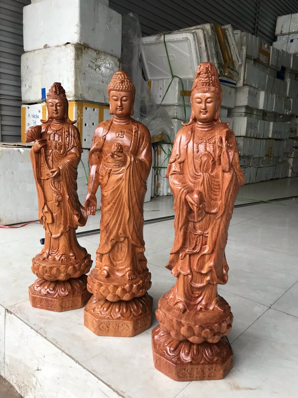 Cách lập ban thờ Tây Phương Tam Thánh. Bộ tượng Tam Thánh Phật đứng cao 60cm gỗ hương đá