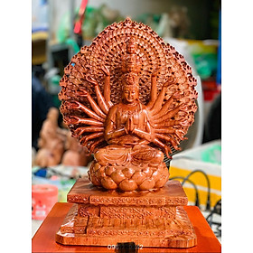 Tượng phật thiên thủ thiên nhãn được làm bằng chất liệu gỗ hương đá tự nhiên. 100% Kích thước cao 35×20×15cm  _ Tượng phật thiên thủy thiên nhãn được trạm khắc tỉ mỉ tinh sảo kỳ công .Đi hầu hết mọi chi tiết góc ngách hoa văn nội củ tượng phật đều được ngọt tỉa chỉnh sửa hoàn toàn bằng tay thủ công .Đồng thời tượng phật được kiểm định rất kỹ lưỡng như cho vào thẩm sấy cho gỗ khô kiệt .Mục đích trống dập nứt vênh mo mối mọt .Kết hợp với đánh giấy giáp kỹ cho sạch sẽ sờ mát lạnh song cho vào phun lót làm bóng mờ .Để giữ lại mầu sắc vân gỗ tự nhiên .Tượng phật thiên thủ thiên nhãn được làm và hoàn thiện do bàn tay khối óc tài hoa .Từ những người thợ dầy rặn  kinh nghiệm .Cũng như tay nghề cao trong làng nghề truyền thống .Chính vì thế tượng phật đã đáp ứng đầy đủ những tiêu trí ( Đẹp bền rẻ ) Thẩm mỹ nghệ thuật với chất lượng tuyệt vời