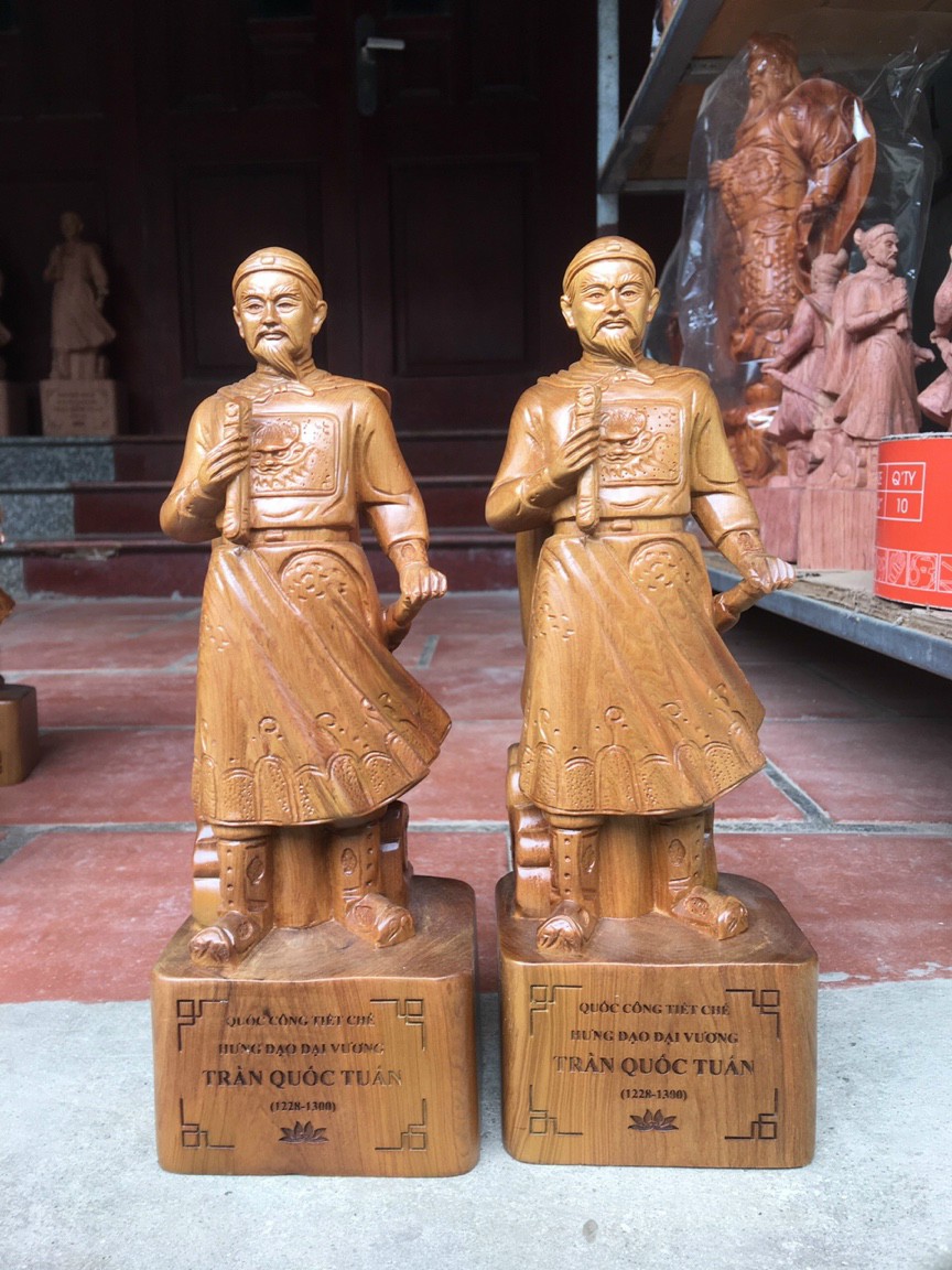 - Kích thước cao 60×20×15cm Tượng trần quốc tuấn trần hương đạo vương được điêu khắc trạm trổ vô cùng tỉ mỉ ,tinh sảo kỳ công .Đi hầu hết tất cả mọi chi tiết góc ngách nội dung hoa văn của tượng đều được gọt tỉa chỉnh sửa hoàn toàn bằng tay thủ công .Đồng thời tượng được kiểm định kỹ lưỡng khắt khe ,như cho vào thẩm sấy cho gỗ khô kiệt .Mục đích trống dập nứt vênh mo mối mọt .Kết hợp với trà nhám, đánh giấy giáp nhiều nước sờ mát lạnh .Rồi cho vào phun lót làm ,bóng mờ để giữ lại mầu sắc vân gỗ tự nhiên .Tượng được làm và hoàn thiện do bàn tay khối óc tài hoa .Từ những người thợ giàu kinh nghiệm ,Cũng như tay nghề cao trong làng nghề truyền thống .Chính vì thế tượng trần quốc tuấn ,trần hưng đạo vương đã đáp ứng đầy đủ những tiêu trí ( Đẹp bền rẻ ) Thẩm mỹ nghệ thuật với chất lượng tuyệt vời