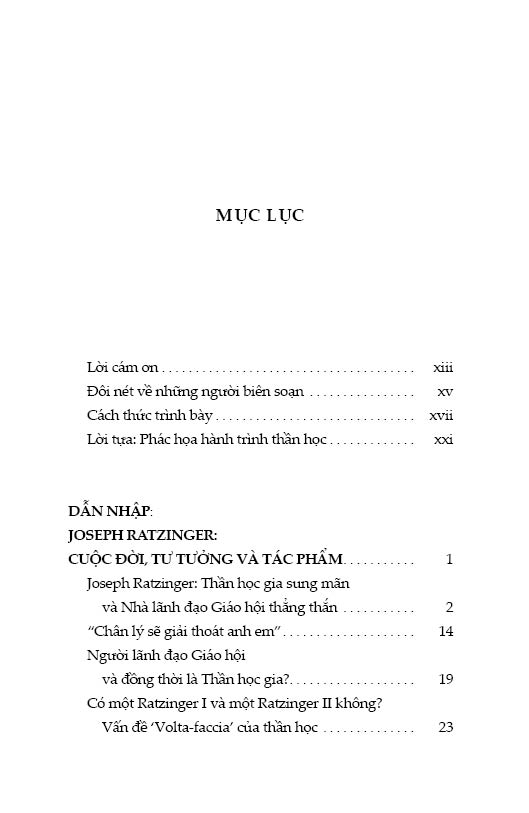 Ở đây, chúng tôi tập chú vào các bài viết của ngài như là cá nhân một thần học gia, một phần bởi vì nhiều bài viết của ngài được trình bày trong tư cách cá nhân theo cách thức không chính thức hơn là trình bày thành những bản văn chính thức mang tính công thức. Nhưng quan trọng hơn, chúng tôi ước mong cung cấp một bức chân dung toàn diện về quan điểm thần học của Ratzinger, phác họa các chủ đề cốt lõi mà ngài đã quan tâm trong những thập niên qua và làm sáng tỏ các nguồn tham khảo, phương pháp và phong cách thần học của ngài. Chúng tôi cũng hy vọng rằng Tuyển tập này sẽ có đủ khả năng cung cấp cho các độc giả bình thường, các sinh viên, các học giả cũng như những chuyên gia thần học Ratzinger, một cái nhìn khái quát về bản chất và cốt lõi thần học của Joseph Ratzinger. Cuối cùng, cũng như chính ngài thường nói, các bài viết của ngài với tư cách cá nhân một thần học gia không chứa đựng Huấn quyền chính thức của Giáo hội, do đó chúng hoàn toàn rộng mở cho những tranh luận, thảo luận và đặt câu hỏi. Do đó, tất cả độc giả có thể khám phá những khía cạnh khác và rút ra những kết luận khác nhau từ những gì bức chân dung tổng quát này mang lại.