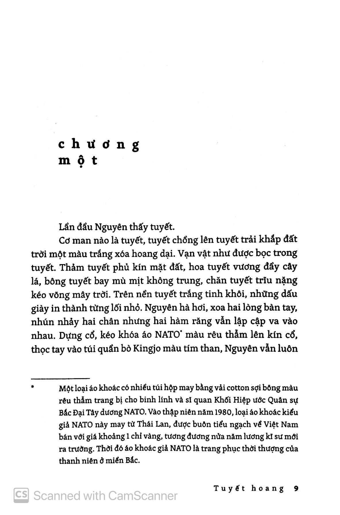 Tuyết Hoang - tiểu thuyết do chính người trong cuộc viết nên ít nhiều có hơi hướng của một tự truyện với những trải nghiệm nơi xứ người suốt một thời trai trẻ. Nhân vật chính là một trí thức Hà Nội. Hành trình của Nguyên cũng là số phận của một thế hệ người Việt thời đó. Họ là những con người mang theo “những khát vọng đổi đời ở một xứ sở xa lạ đầy cám dỗ hấp dẫn vật chất nhưng cũng là những cạm bẫy đời người nguy hiểm.”