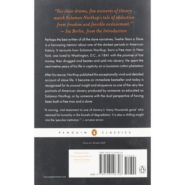 Born a free man in New York State in 1808, Solomon Northup was kidnapped in Washington, D.C., in 1841. He spent the next twelve years as a slave on a Louisiana cotton plantation. During this time he was frequently abused and often afraid for his life. After regaining his freedom in 1853, Northup published this gripping account of his captivity. As an educated man, Northup was able to present an exceptionally detailed description of slave life and plantation society. Indeed, this book is probably the fullest, most realistic picture of the 'peculiar institution' during the three decades before the Civil War. Northup tells his story both from the viewpoint of an outsider, who had experienced thirty years of freedom and dignity in the United States before his capture, and as a slave, reduced to total bondage and submission. Very few personal accounts of American slavery were written by slaves with a similar history. This extraordinary slave narrative, new to Penguin Classics, has a new introduction by prize-winning historian and author Ira Berlin, an an essay by Henry Louis Gates Jr.