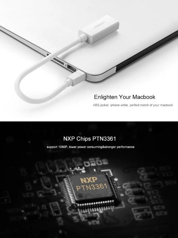 Ugreen 10460 Mini dp to HDMI female converter đầu chuyển đổi cable Support 1920*1080 60 MD112 1. Length: 18CM 2. Color : White 3. Mini DP - HDMI(âm) Full HD (1920 x 1080p) 4. 60g