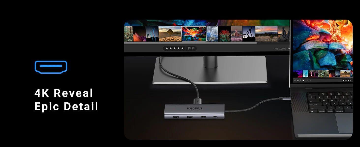 - Sản phẩm chính hãng Ugreen - Bộ chuyển đổi 6 trong 1 tiện dụng - Chuyển đổi tín hiệu USB-C sang HDMI - 3 cổng USB-A 3.0 - Hỗ trợ xuất hình ảnh độ