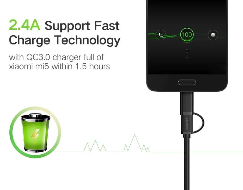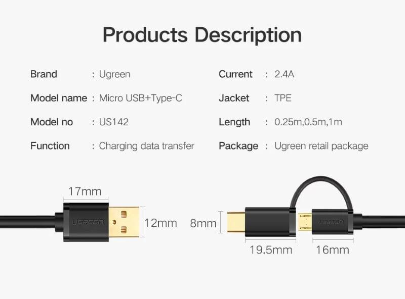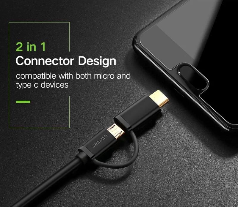 Mua tại TiktokUgreen 30173 Usb 2.0 To Micro Usb + Type C Data Cable Black 0.5M Us142
