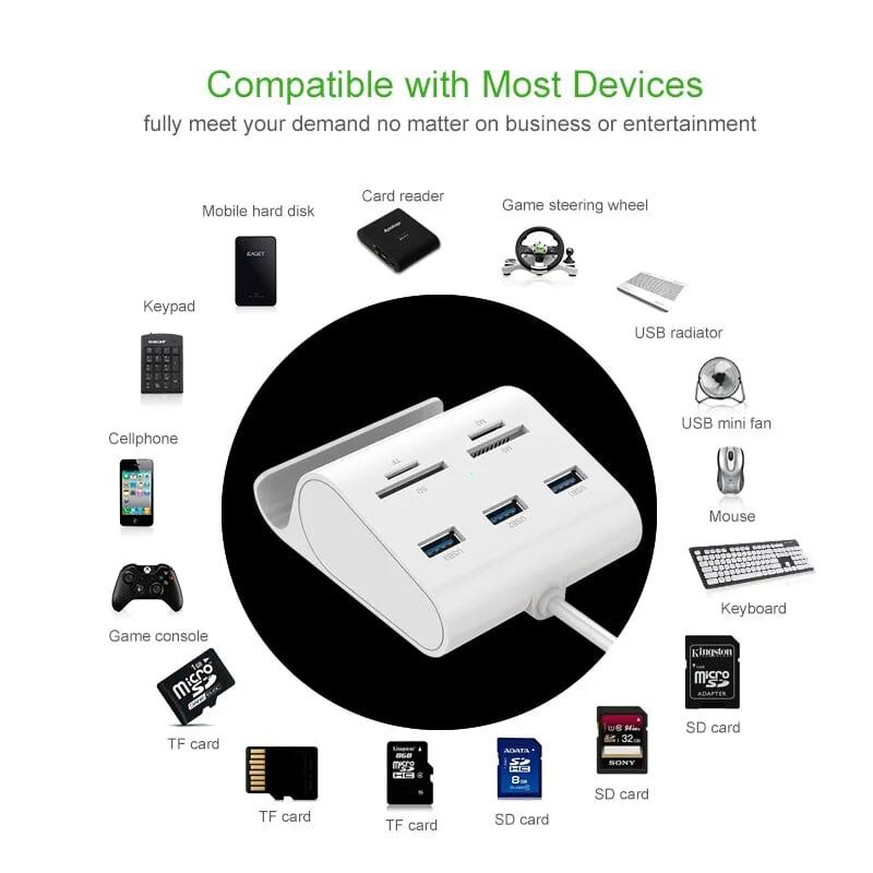 Ugreen 30344 1m màu trắng usb 3.0 3 ports hub + card reader with cradle us156 1. Support TF/SD/MS/CF card 2. Color : White 3. Length: 1m 4. 250g 5. 20 x 20 x 5