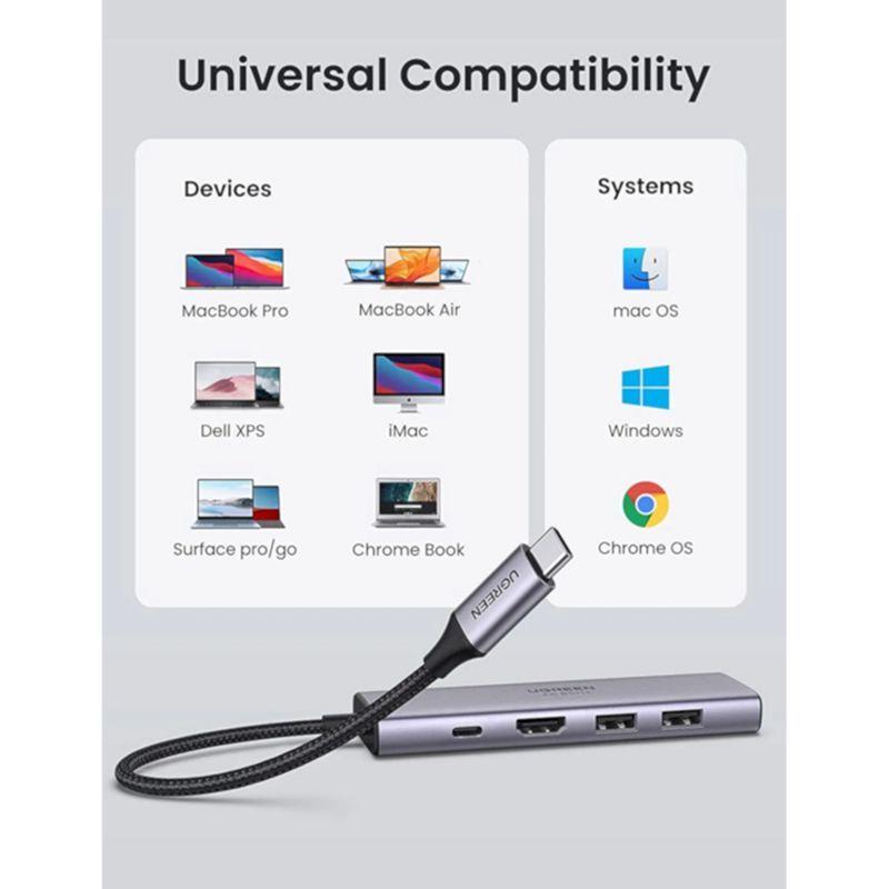Ugreen 20010919 5 trong 1 màu xám Bộ chuyển type c To 2 * USB 3.0 A + HDMI + RJ45 + PD Converter CM418 10010919