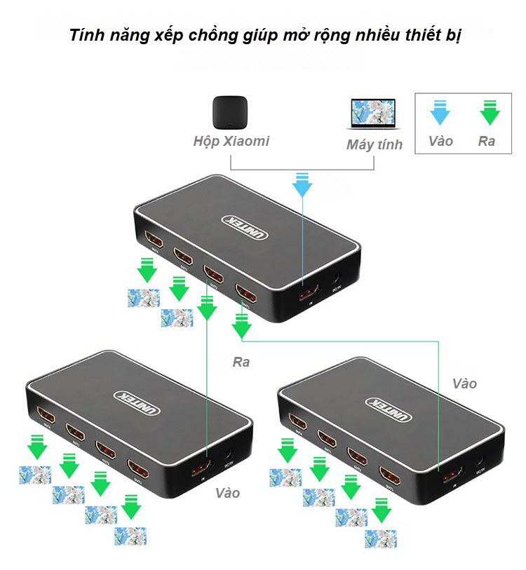 - Bộ chia HDMI Switch Vention 1 ra 2 cho phép chia một tín hiệu ra hai cổng HDMI, hỗ trợ đệm và khuếch đại tín hiệu đầu ra cho hình ảnh và âm thanh