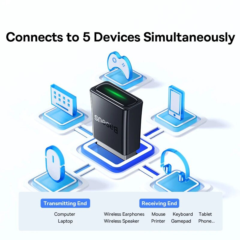 Tính Năng Usb Blueeoth 5.3 Tốc Độ Cao Kết Nối 5 Thiết Bị Cùng Lúc Basuse BA07 Bluetooth Receiver Dùng Cho Win 8.1 Trở Lên • Với khả năng kết nối qua Bluetooth 5.3, Baseus
