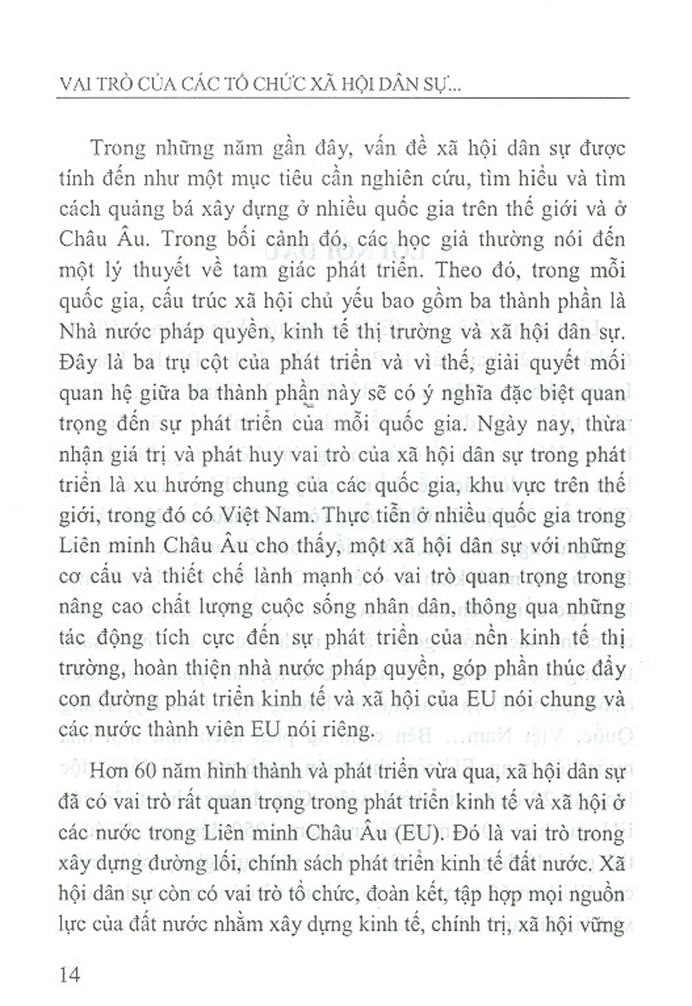 Thực tiễn hơn 60 năm hình thành và phát triển vừa qua ở nhiều quốc gia trong Liên minh Châu Âu (EU) cho thấy, một XHDS với những cơ cấu và thiết chế lành mạnh có vai trò quan trọng trong nâng cao chất lượng cuộc sống người dân, thông qua những tác động tích cực đến sự phát triển của nền kinh tế thi trường, hoàn thiện nhà nước pháp quyền, góp phần thúc đẩy con đường phát triển kinh tế và xã hội của EU nói chung và các nước thành viên EU nói riêng. Ngày nay, thừa nhận giá trị và phát huy vai trò của XHDS trong phát triển là xu hướng chung của các quốc gia, khu vực trên thế giới, trong đó có Việt Nam. Việc nghiên cứu có hệ thống từ lý thuyết đến thực tiễn vai trò của các tổ chức XHDS trong sự phát triển kinh tế và xã hội ở một số nước EU hiện nay là rất cần thiết. Từ đó có thể gợi mở nhiều điều cho Việt Nam, đặc biệt trong bối cảnh Việt Nam đang tích cực hội nhập sâu sắc vào nền kinh tế thế giới, đang phát huy mọi nguồn lực đất nước để thực hiện thành công sự nghiệp công nghiệp hóa vào năm 2020. Để hiểu rõ hơn về XHDS và vai trò của XHDS trong phát triển kinh tế xã hội, năm 2018, Nhà xuất bản Khoa học xã hội xuất bản cuốn sách chuyên khảo: “Vai trò của các tổ chức xã hội dân sự trong phát triển kinh tế và xã hội ở một số quốc gia trong Liên minh Châu Âu” do PGS.TS. Đinh Công Tuấn và TS. Đinh Công Hoàng đồng chủ biên.