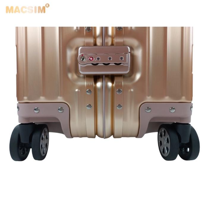 Toàn bộ thân vỏ vali Macsim làm bằng hợp kim nhôm A6063 làm cho vali rất nhẹ, độ đàn hồi cao, chống ăn mòn, chịu được tải trọng lớn.