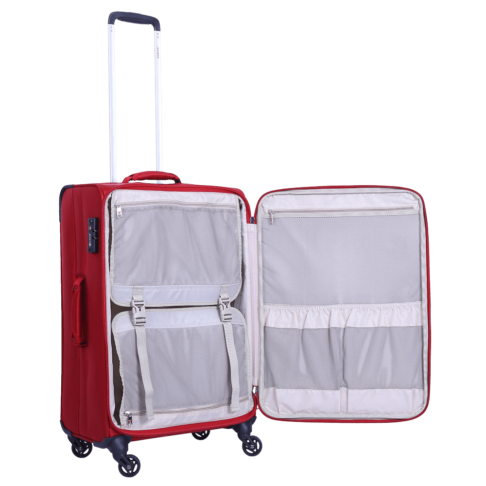 Vali Kéo Du Lịch  đen Phối  đỏ Có Nắp - 22 Inch được thiết kế từ chất liệu vải Polyester có độ bền cao, chống thấm nước tối ưu giúp bảo vệ hành lý bên