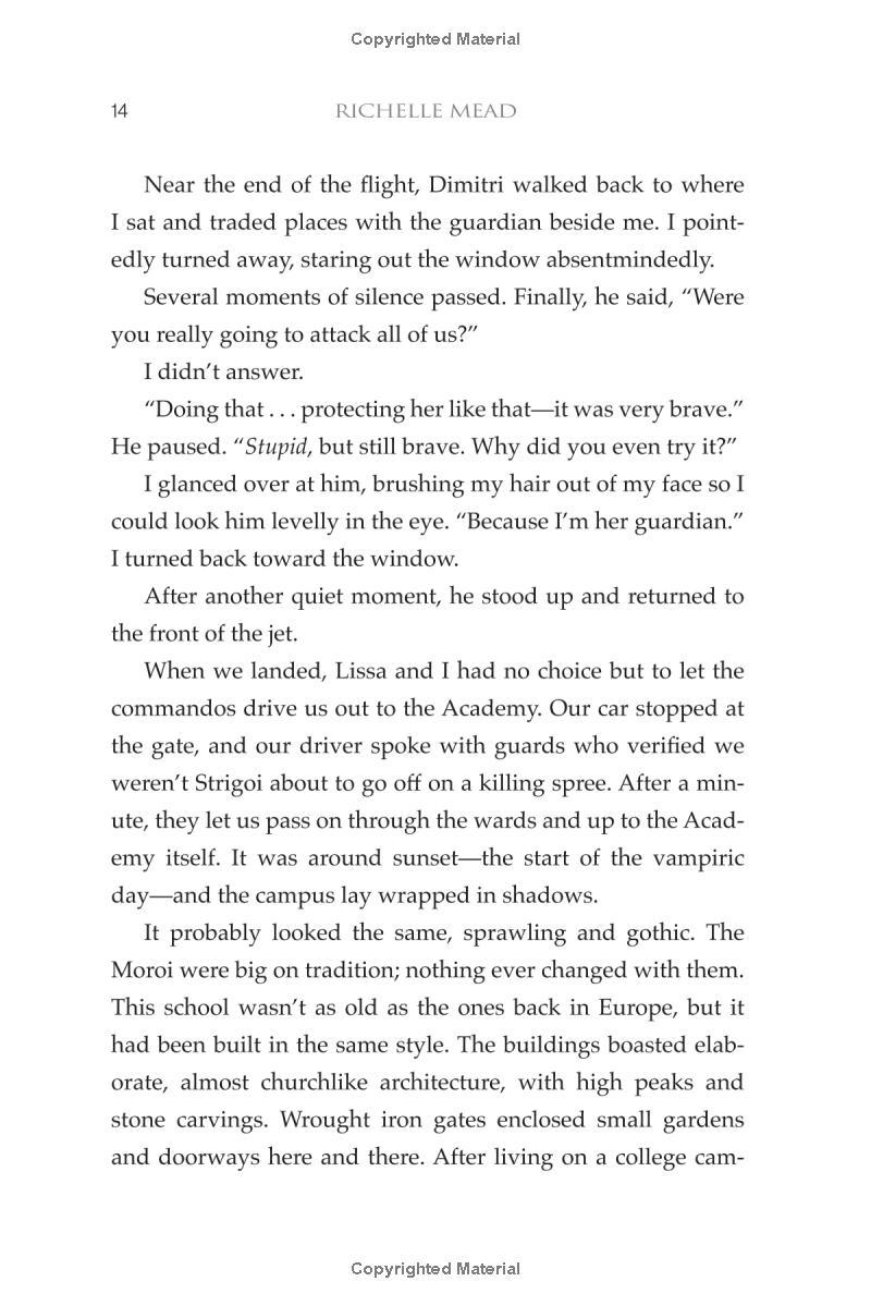 The story that kicked off the international #1 bestselling "Vampire Academy" series is NOW A MAJOR MOTION PICTURE! St. Vladimir s Academy isn t just any boarding school it s a hidden place where vampires are educated in the ways of magic and half-human teens train to protect them. Rose Hathaway is a Dhampir, a bodyguard for her best friend Lissa, a Moroi Vampire Princess. They ve been on the run, but now they re being dragged back to St. Vladimir s the very place where they re most in danger. . . .Rose and Lissa become enmeshed in forbidden romance, the Academy s ruthless social scene, and unspeakable nighttime rituals. But they must be careful lest the Strigoi the world s fiercest and most dangerous vampires make Lissa one of them forever. "