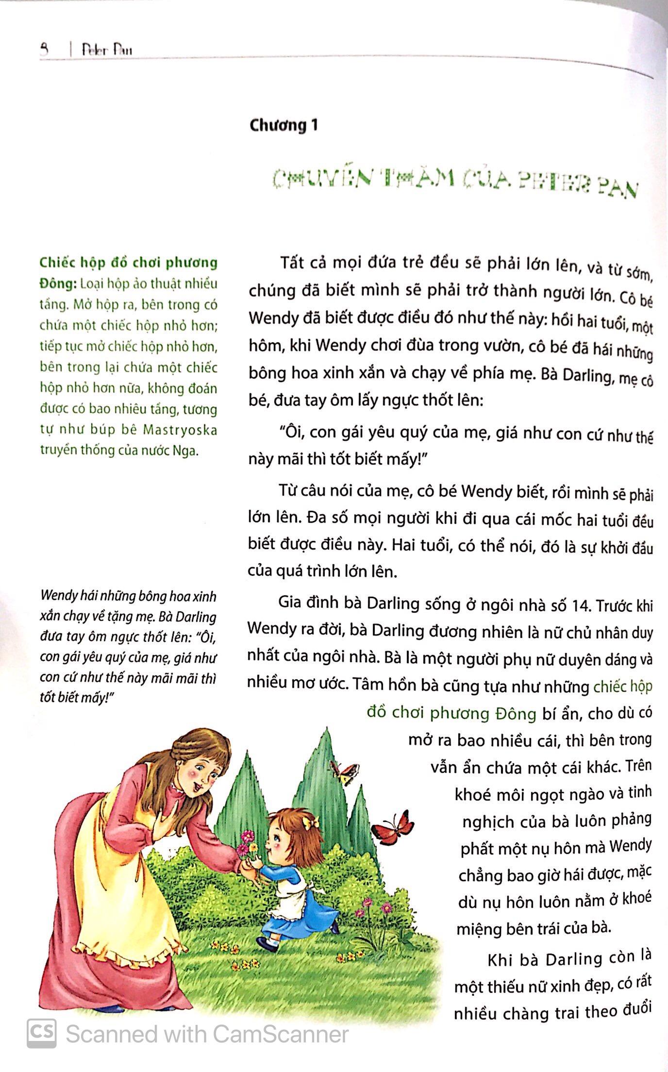 Mua tại TiktokPeter Pan được biết đến là đứa trẻ không bao giờ lớn. Anh chàng dạy 3 đứa trẻ là Wendy, John và Micheal học bay. Nhân lúc bố mẹ không có nhà, chúng đã bay đến xứ sở Neverland bí ẩn. Trên đảo có các nàng tiên nhỏ, đám cướp biển và các nàng tiên cá mà các em nhỏ đã quen thuộc trong truyện cổ tích. Trong câu chuyện, Peter và các bạn nhỏ được cùng nhau vui chơi và trải qua những chuyến du lịch mạo hiểm nhưng không kém phần thú vị. Thông qua hình tượng nhân vật Peter Pan, độc giả sẽ nhận ra rằng: tuổi thơ ấu là một áng văn chương tươi đẹp nhất, mơ mộng nhất trong một cuốn sách lớn của đời người. Mỗi bạn nhỏ, hãy tự viết cho mình một cuốn sách cuộc đời và tận hưởng những niềm vui thuộc về bản thân.