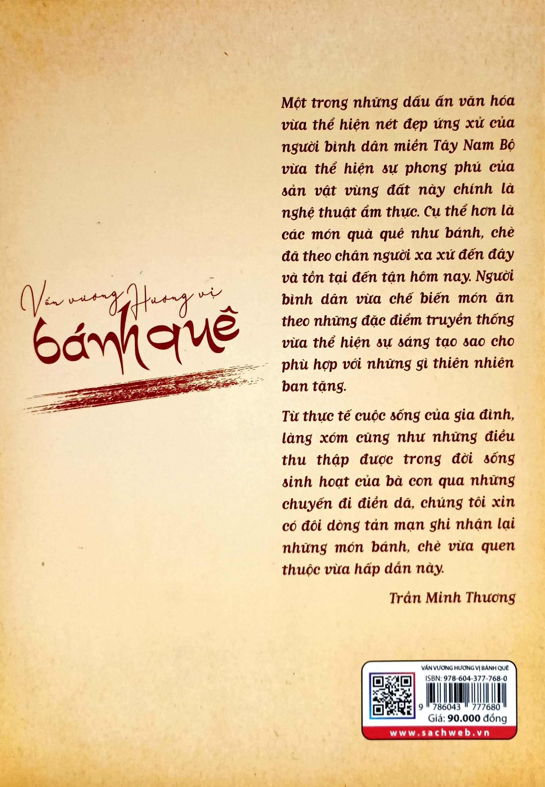Vấn Vương Hương Vị Bánh Quê Một trong những dấu ấn văn hóa vừa thể hiện nét đẹp ứng xử của người bình dân miền Tây Nam Bộ vừa thể hiện sự phong phú của sản vật vùng đất này, chính là nghệ thuật ẩm thực. Cụ thể hơn là các món quà quê như bánh, chè đã theo chân người xa xứ đến đây và tồn tại đến tận hôm nay. Người bình dân vừa thể hiện sự sáng tạo sao cho phù hợp với những gì thiên nhiên ban tặng. Từ thực tế cuộc sống của gia đình, làng xóm cũng như những điều thu thập được trong đời sống sinh hoạt của bà con qua những chuyến đi điền dã, chúng tôi xin có đôi dòng tản mạn ghi nhận lại những món bánh, chè vừa quen thuộc vừa hấp dẫn này. Xin được trân trọng giới thiệu với đọc giả gần xa, những quý vị quan tâm và yêu thích văn hóa dân gian vùng đất Chín Rồng trù phú quyển sách Vấn vương hương vị bánh quê.