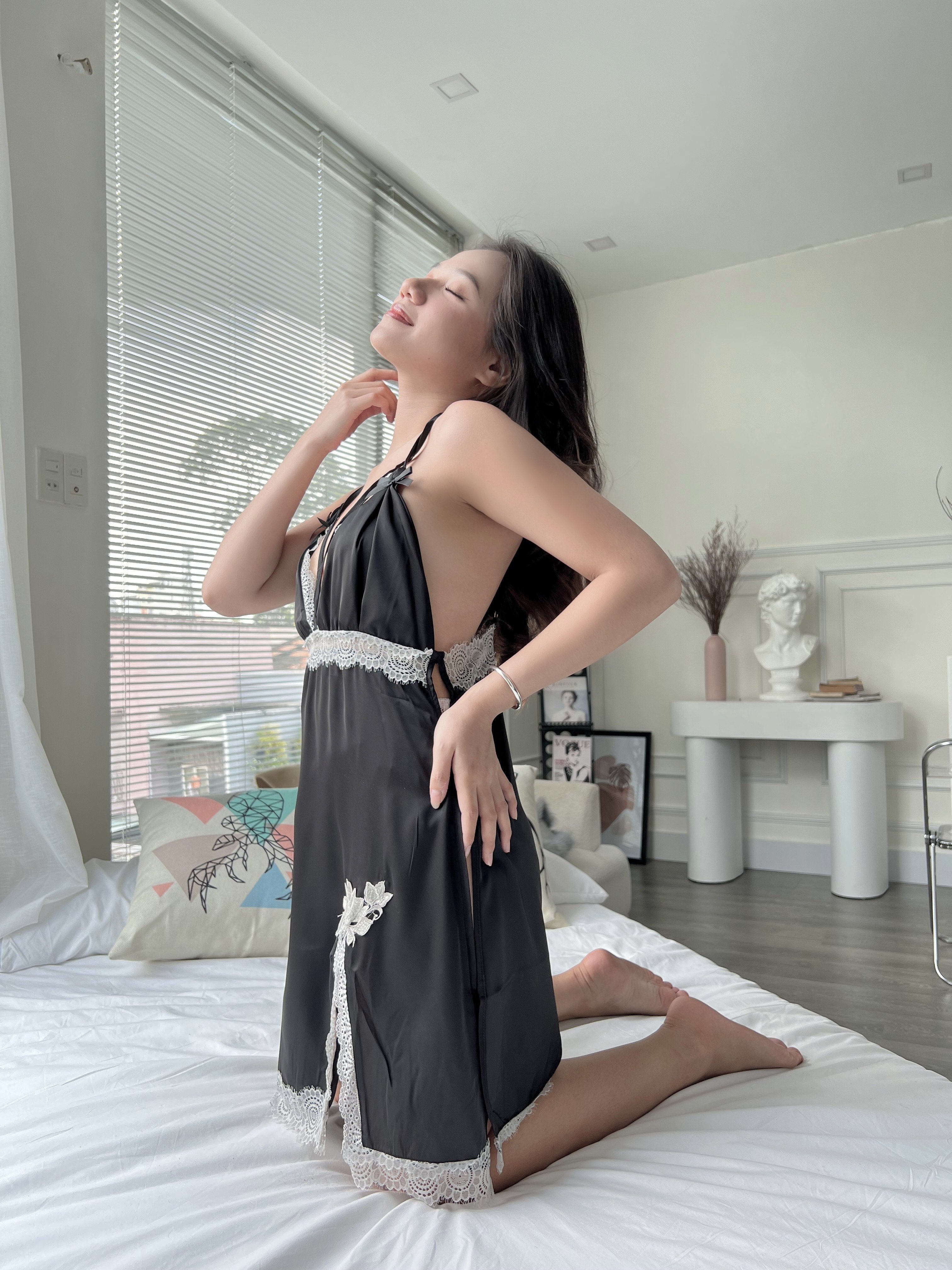 DNC11 thiết kế kiểu dáng áo yếm, khoét ngực, phía sau hở lưng tôn lên vẻ đẹp quyên rũ, gợi cảm giúp các nàng trở nên hấp dẫn, ngọt ngào hơn với "bạn cùng giường" Kiểu dáng: Đầm
