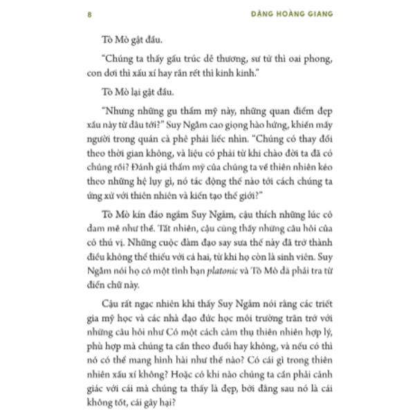 Cuốn sách chứa đựng nhiều quan điểm triết học, khối lượng thông tin tương đối phong phú liên quan đến quan điểm mỹ học, thế giới sinh vật… nhưng được truyền tải một cách khéo léo, dễ tiếp cận qua những cuộc đối thoại, trò chuyện đời thường giữa cặp đôi nhân vật Tò Mò & Suy Ngẫm, giúp khơi gợi ở bạn đọc cách cảm nhận đúng về vẻ đẹp của thiên nhiên: Thiên nhiên đẹp như nó vốn có, không phụ thuộc vào các quy chuẩn đẹp mà chúng ta áp cho con người và khi đã yêu thiên nhiên, một cách tự nhiên, chúng ta sẽ biết cách bảo vệ thiên nhiên.
