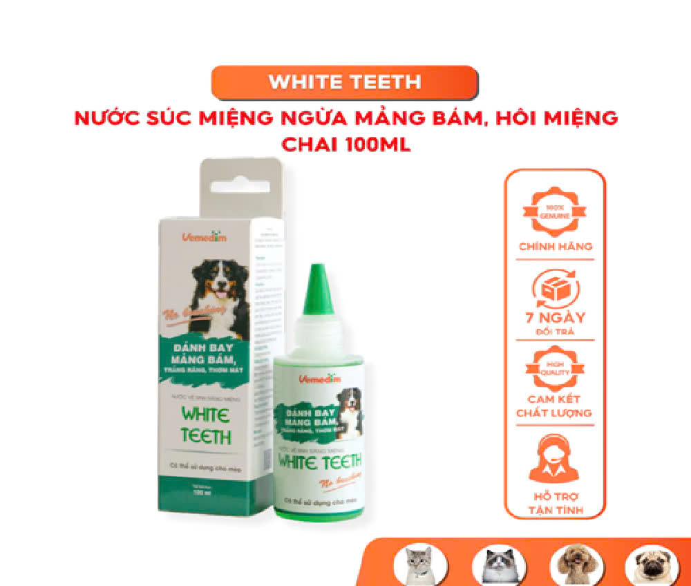 Vemedim WHITE TEETH Nước súc miệng đánh bay mảng bám, trắng răng, thơm mát dùng cho chó, mèo, chai 100ml