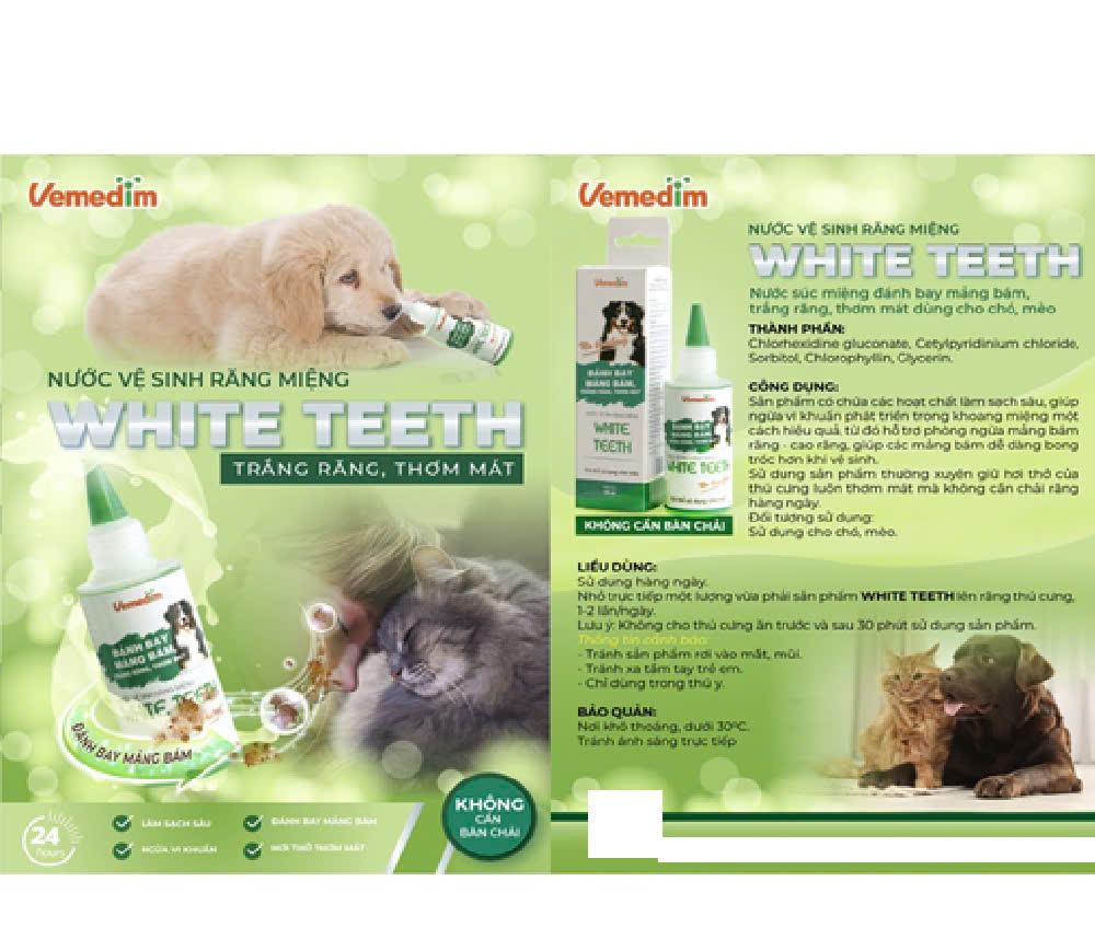 Vemedim WHITE TEETH Nước súc miệng đánh bay mảng bám, trắng răng, thơm mát dùng cho chó, mèo, chai 100ml Thành phần: Chlorhexidine gluconate, Cetylpyridinium chloride, Sorbitol, Chlorophyllin, Glycerin. Công dụng: Sản phẩm có chứa