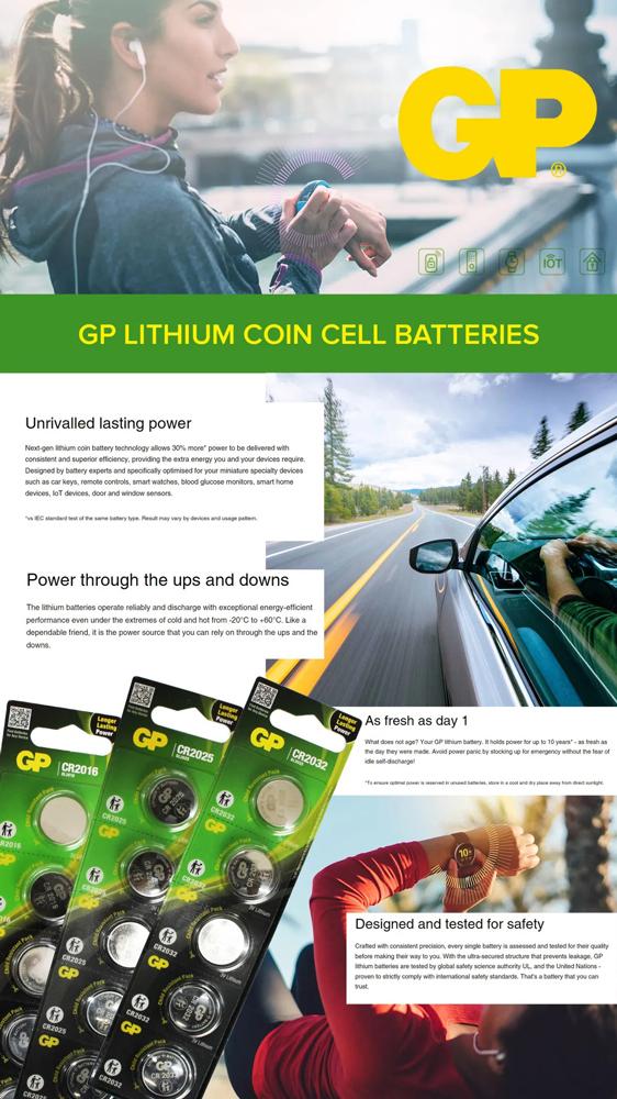Vỉ 5 Pin Cúc Áo GP Lithium Coin Battery 3V - GP CR2025-2CPU5 Pin GP Lithium Coin CR2025 có mật độ năng lượng cao và có thể cung cấp thêm 30% năng lượng* cho các thiết bị nhỏ như chìa khóa xe, điều khiển từ xa, đồng hồ thông minh, máy đo đường huyết, thiết bị nhà thông minh, thiết bị IoT, cảm biến cửa và cửa sổ . Với đặc tính tiết kiệm năng lượng vượt trội và thời hạn sử dụng lên tới 10 năm khi được bảo quản đúng cách ở nơi khô ráo và thoáng mát, bạn sẽ không bao giờ gặp phải tình trạng hết pin. Được chế tạo để hoạt động ngay cả trong những điều kiện khắc nghiệt, có thể hoạt động tốt trong điều kiện nhiệt độ từ -20°C đến +60°C. Những loại pin này không chỉ được thiết kế để bảo vệ các thiết bị của bạn với cấu trúc chống rò rỉ mà còn để bảo vệ những người thân yêu của bạn bằng bao bì chống trẻ em được thiết kế chu đáo. GP là công ty hàng đầu tại Hồng Kông về sản xuất pin và các sản phẩm liên quan đến pin. GP được niêm yết trên thị trường chứng khoán Singapore từ năm 1991. Sáng lập bởi Tập đoàn Gold Peak tại Hồng Kông, GP Batteries đứng thứ nhất tại thị trường Hồng Kông, thứ ba trên thế giới về lĩnh vực pin, và các sản phẩm liên quan đến pin, ứng dụng trong các sản phẩm từ cuộc sống hàng ngày đến lĩnh vực công nghiệp.