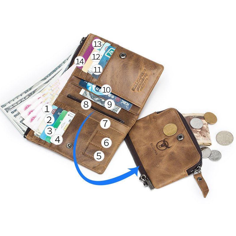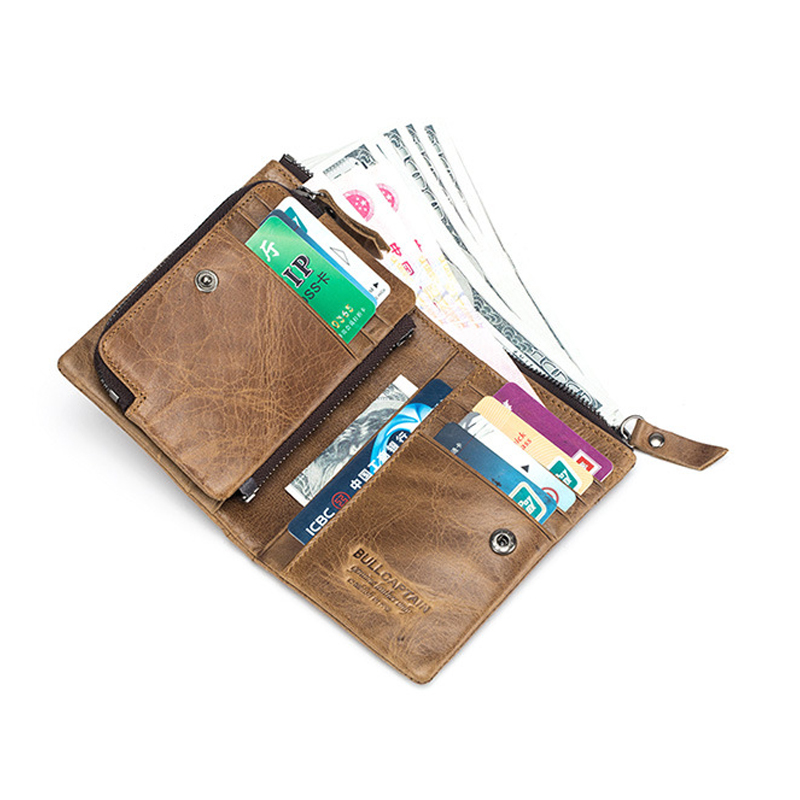 - Ví nam được làm bằng chất liệu da bò cao cấp tạo kiểu dáng lạ mắt, sang trọng. - Thiết kế nhỏ gọn, thời trang, dạng ví nam xếp đôi, có nhiều ngăn tiện