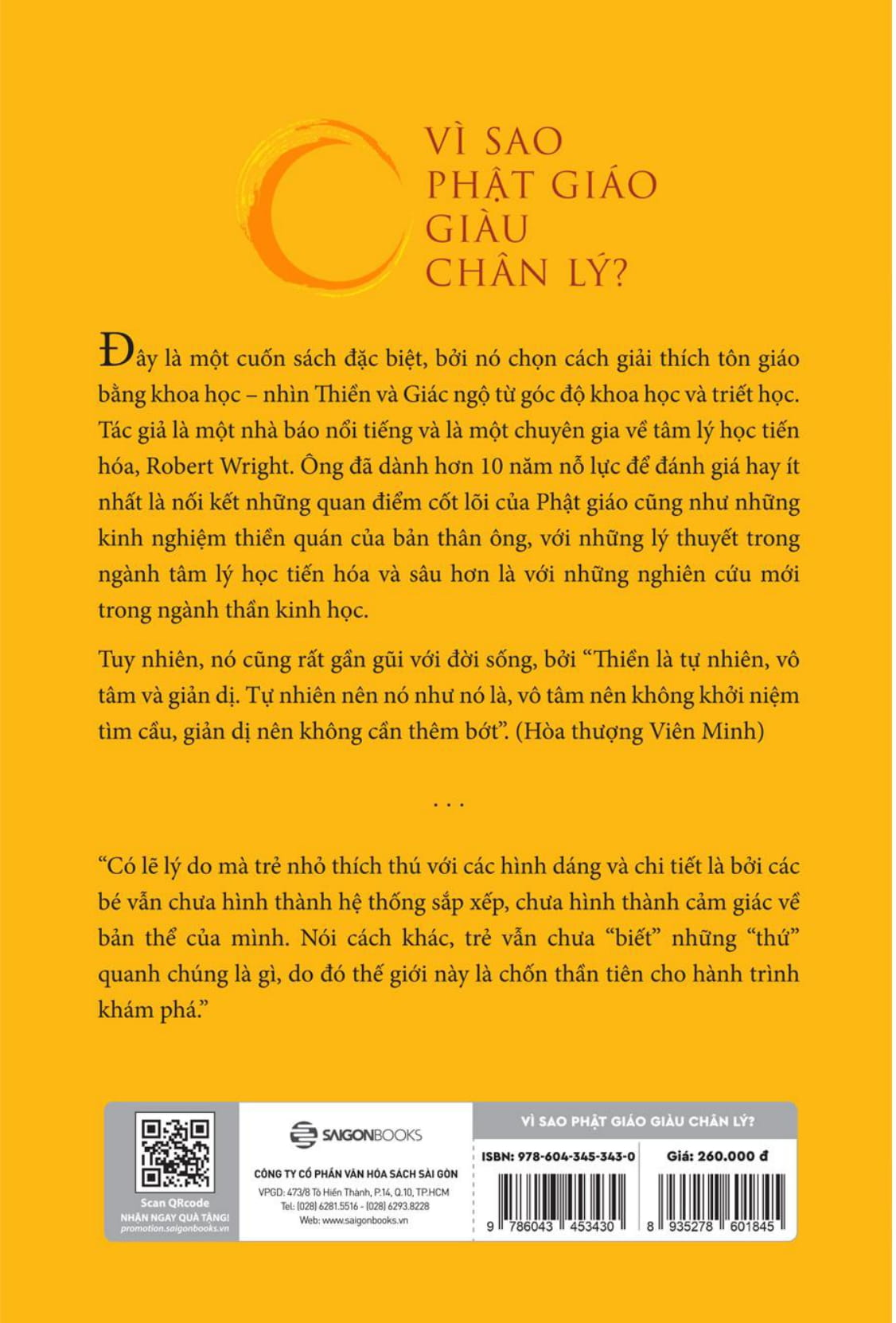 Với Vì sao Phật giáo giàu chân lý?, Robert Wright sẽ không lân la vào những phần quá chi tiết của tâm lý và triết lý nhà Phật. Chẳng hạn Tạng vi diệu pháp –một bộ tổng hợp những ghi chép của Phật giáo nguyên thủy – cho rằng có 89 loại tâm thức, trong đó bao gồm 12 tâm bất thiện. Các bạn hẳn sẽ cảm thấy nhẹ nhõm khi biết rằng cuốn sách này sẽ không đi vào những vấn đề ấy.
